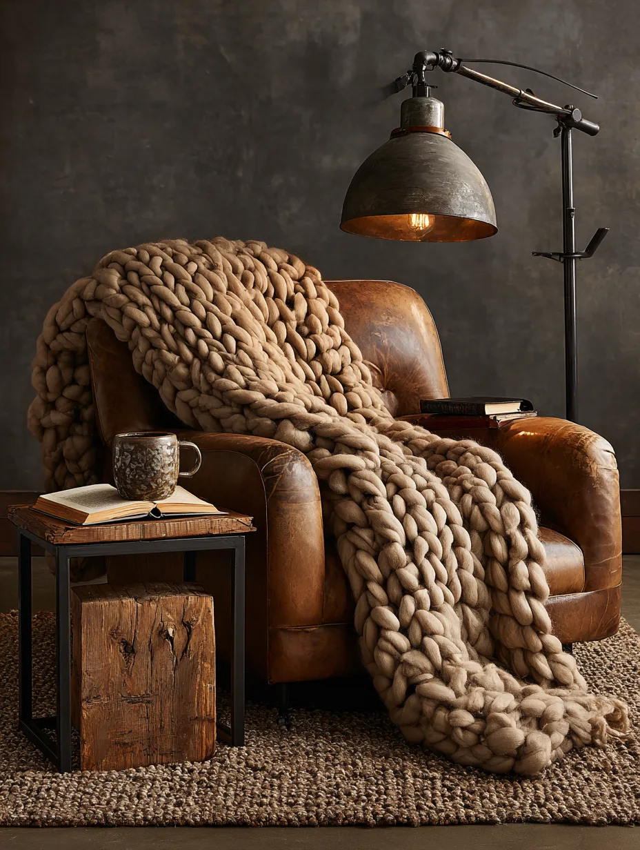 Industrial spaces don't have to feel cold! The 'Industrial Artisan' is all about softening the edges with comfort and handcrafted details. Create a cozy reading nook with a worn leather armchair, a soft chunky knit blanket, and a strategically placed side table made from distressed metal and wood. 📚 Add a warm, ambient light from a floor lamp with an industrial design. Consider a soft rug underfoot to add warmth and absorb sound. It's these thoughtful touches that transform raw industrial elements into a welcoming sanctuary. ✨ Save this for your cozy nook inspiration! #CozyIndustrialIdeas#ReadingNookIdeas#WornLeatherArmchairIdeas#ChunkyKnitBlanketIdeas#IndustrialComfortIdeas#HomeDecorInspo#RelaxationSpace#ComfortableLiving#InteriorStyling#ArtisanComfort