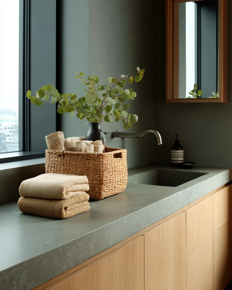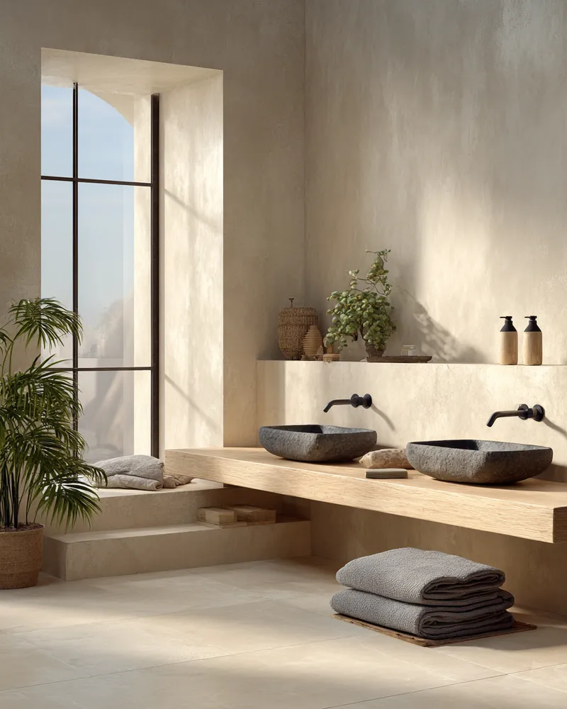 Bring the tranquility of Japan and the simplicity of Scandinavia into your bathroom. The Japandi aesthetic creates a spa-like retreat, prioritizing peace and natural beauty. 💧
