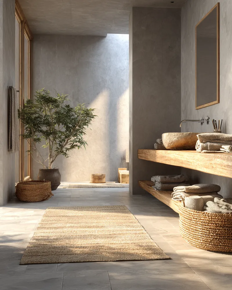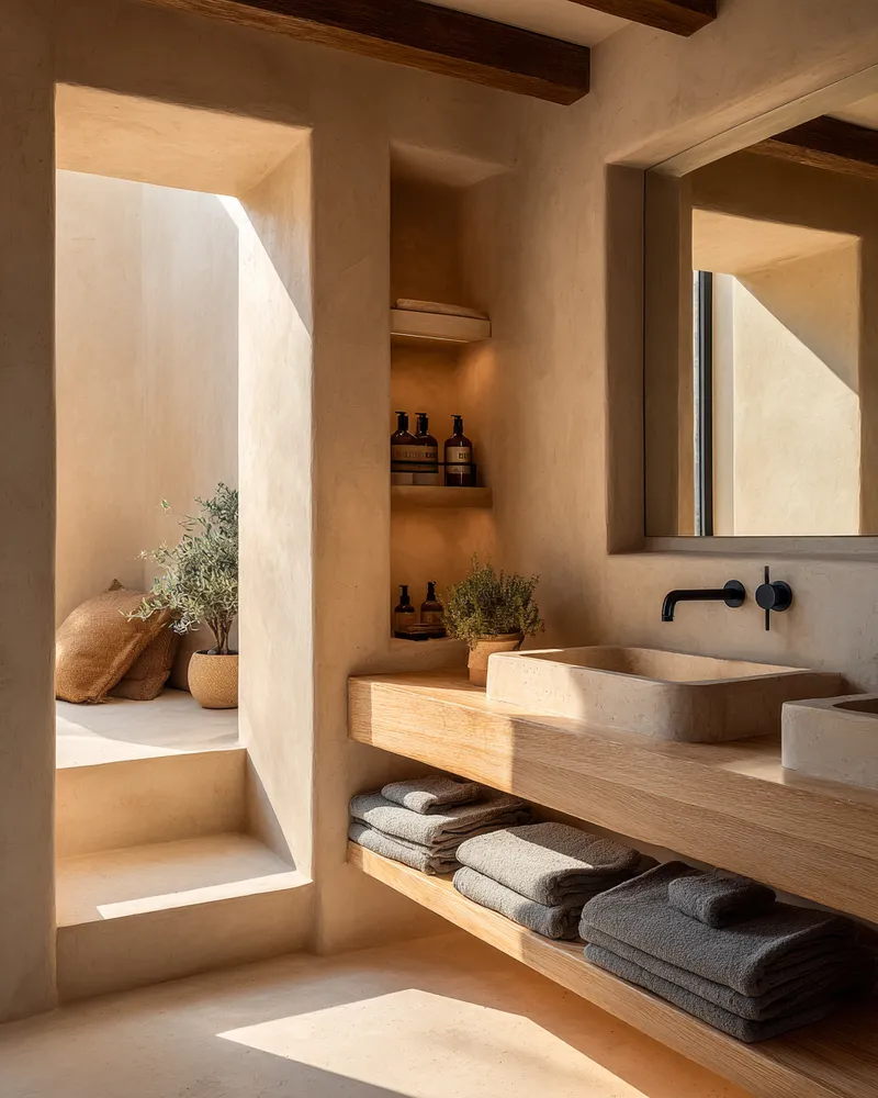 Your personal oasis awaits. Save this for your bathroom spa! 🌿 #JapandiIdeas#BathroomIdeas#SereneBathroomIdeas#HomeDesignIdeas#MinimalistBathroomIdeas#JapandiStyle#SpaBathroom#NaturalElements#WoodVanity#CalmDecor