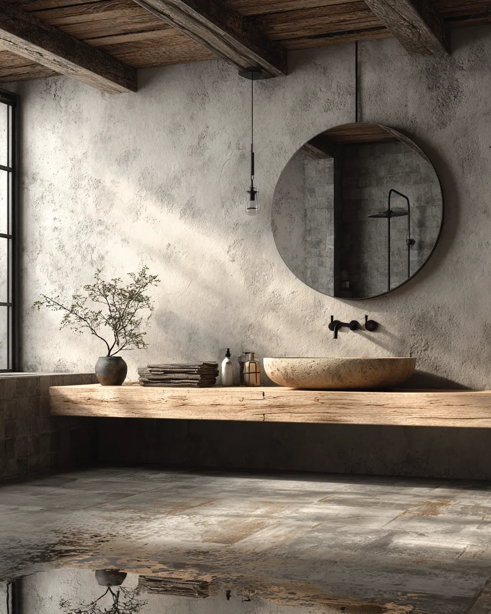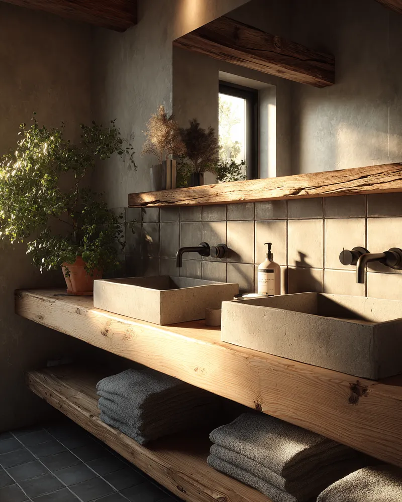 * **Natural Materials:** Wood vanities, stone accents, bamboo elements.