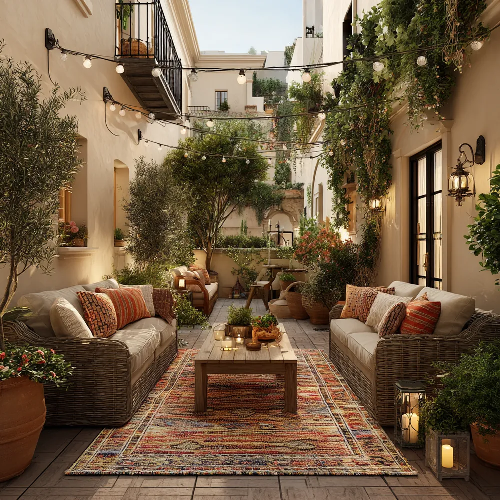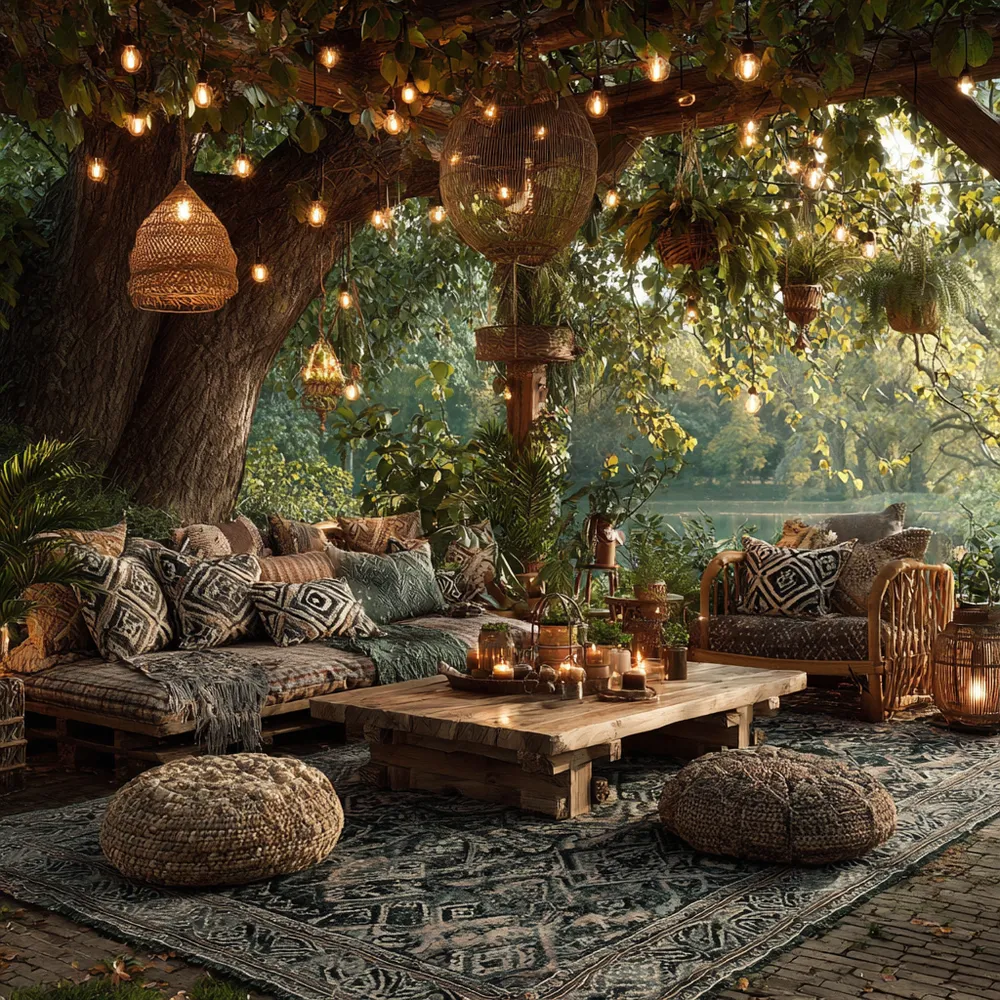 Your outdoor space is an extension of your bohemian spirit! Cultivate a free-spirited garden haven with layered textiles, abundant greenery, and eclectic decor. Comfortable seating, vibrant floor cushions, and a patterned rug set the scene. String lights add a magical evening ambiance. Mix and match furniture for that perfect, relaxed vibe. It’s about creating a personal sanctuary to relax, entertain, and connect with nature in true boho style! 🌿
