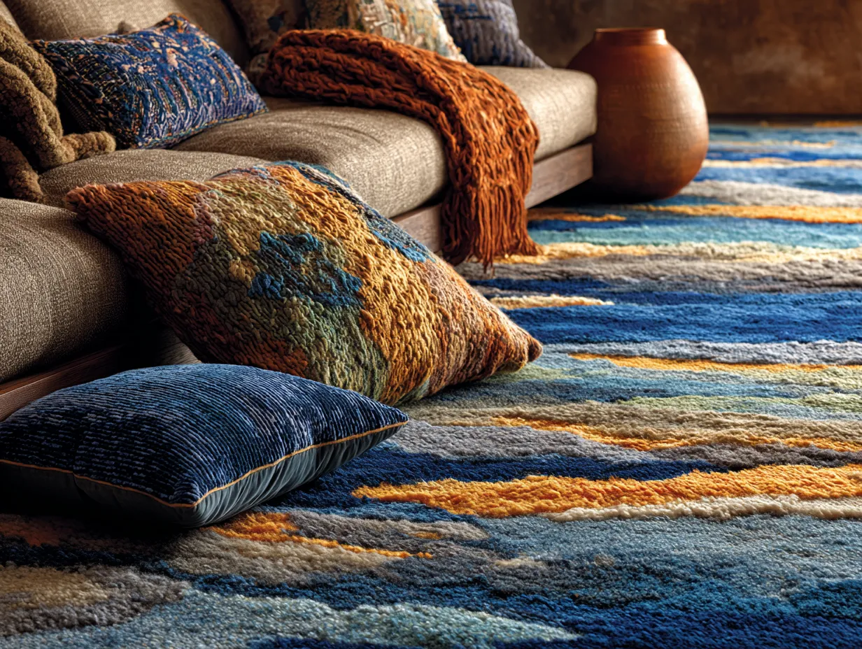Infuse your space with artful layers that engage the senses. Save this for your textile artistry! #DynamicTextiles#ArtfulLayers#TextileIdeas#DynamicTextileIdeas#ArtfulLayerIdeas#HomeDecorIdeas#ExpressiveTexturesIdeas#InteriorDesign#HomeDecor#RugDesign#CushionDecor#TexturedDecor