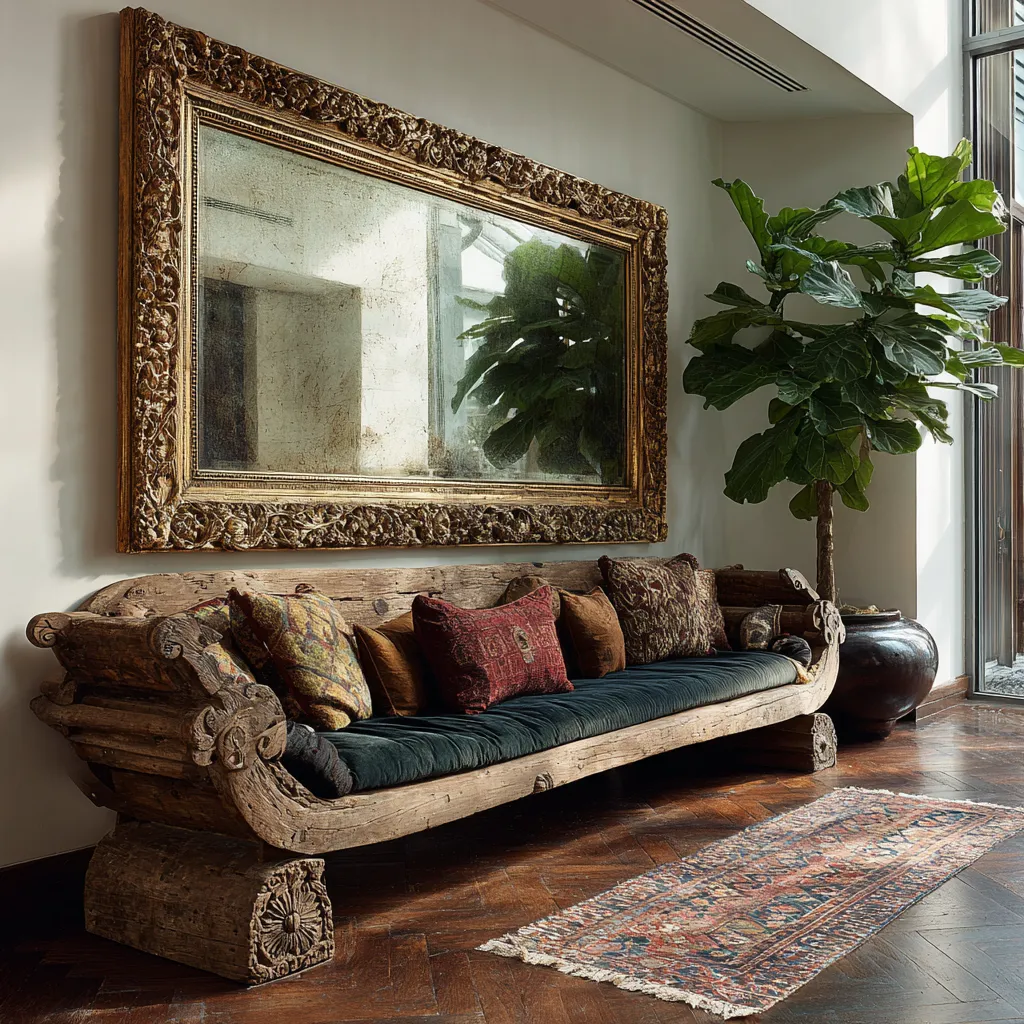 Make a memorable first impression with an entryway that whispers 'adventure'! 🗺️ Draw inspiration from global markets with a vintage carved wooden bench from India, layered with plush cushions. A large, ornate mirror with a distressed finish can amplify the light and create a sense of space. Don't forget natural elements like a statement Fiddle Leaf Fig or woven baskets for storage. Add a touch of color with a small hand-painted rug or decorative tile accent. Let your entryway tell your travel story! ✨ Save this for your entryway inspo! #EntrywayDecor #GlobalEntrywayIdeas #WanderlustHomeDecor #EntrywayIdeas #TravelInspiredDesign #HomeDecorInspiration #VintageDecor #IndianDecor #CarvedWood #HallwayDecor #BohoEntryway