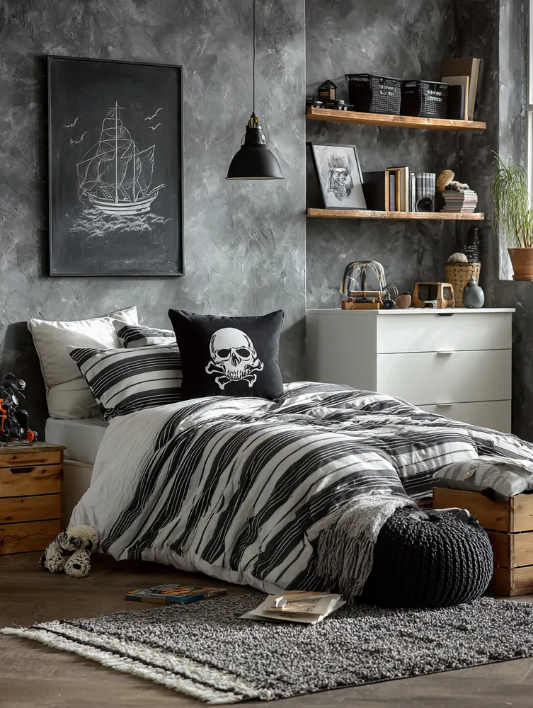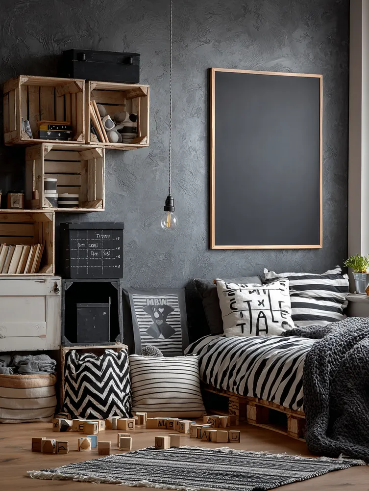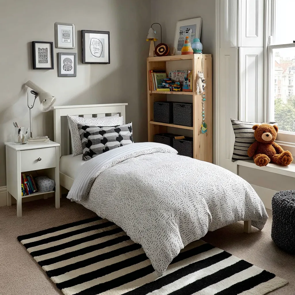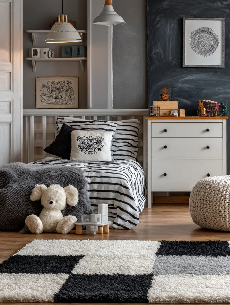 Who says kids' rooms can't be stylish? Embrace a chic monochromatic theme for a space that grows with them! ⚫⚪ Start with a neutral base of black, white, and grey, then inject personality through playful textures and fun accessories. Think a black and white striped rug, white furniture with subtle black detailing, and bedding featuring fun graphic prints. Display their artwork proudly against a white wall for a gallery-like feel. Soften the look with plush stuffed animals and colorful toys that can be stored in stylish monochrome bins. A balanced approach creates a room that's both stimulating and serene. Save for your modern kid's room! 🤍🖤 #MonochromeKidsRoom#KidsRoomIdeas#StylishKidsRoom#MonochromeChildrensRoomIdeas#NurseryDecor#PlayroomDesign#ModernKids#HomeDecor#BlackAndWhiteKids#ChicNursery