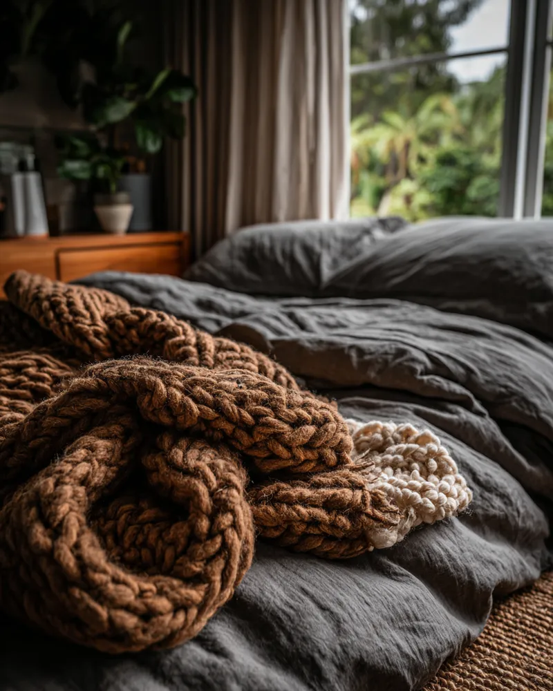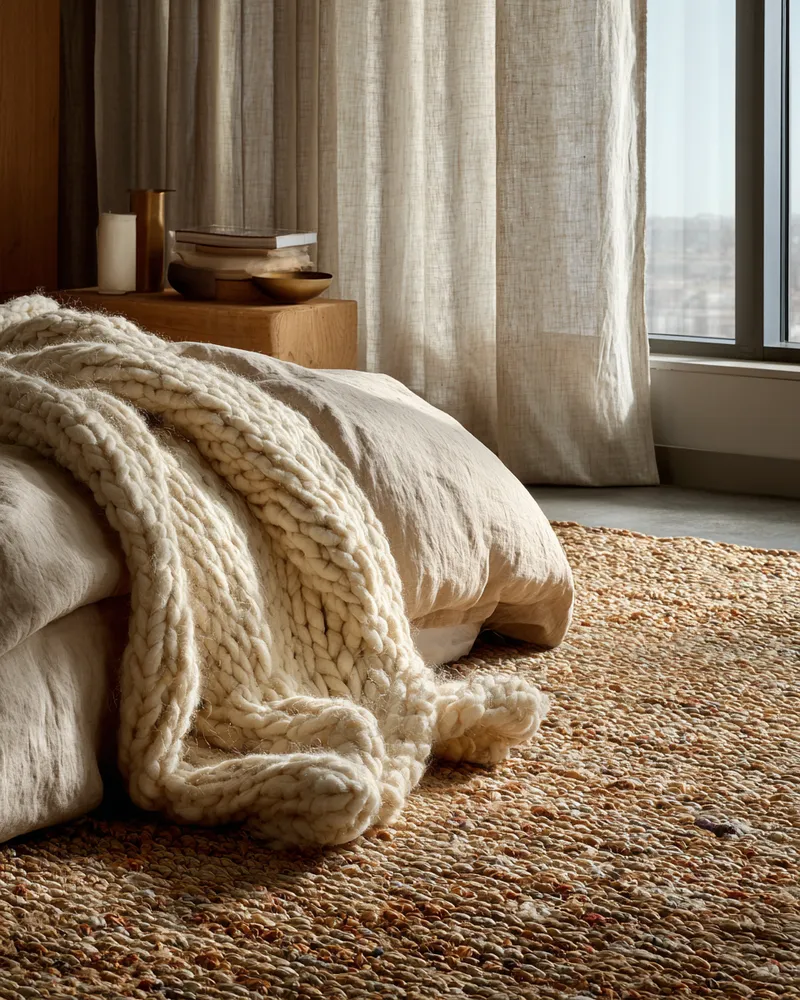 Create a sleep sanctuary that whispers tranquility with the gentle textures of Japandi design. It's about comfort that nourishes the soul. ☁️ **Textural Layers:** * **Linen Bedding:** Breathable and soft, for a relaxed feel. * **Chunky Knit Throws:** For added warmth and cozy dimension. * **Natural Fiber Rugs:** Like jute or sisal, to ground the space. * **Cotton or Bamboo Curtains:** Allowing soft light to filter through. * **Smooth Wood Finishes:** For furniture that feels organic and inviting. Each texture contributes to a peaceful environment for rest. Save these ideas for your tranquil bedroom!