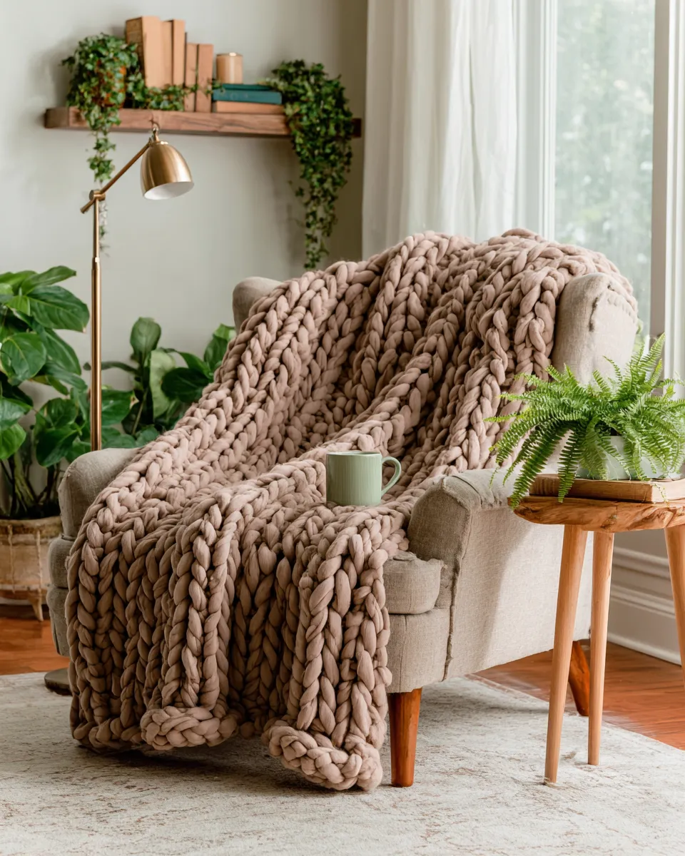 * **Natural textures:** A soft, woven throw blanket and a wooden side table.