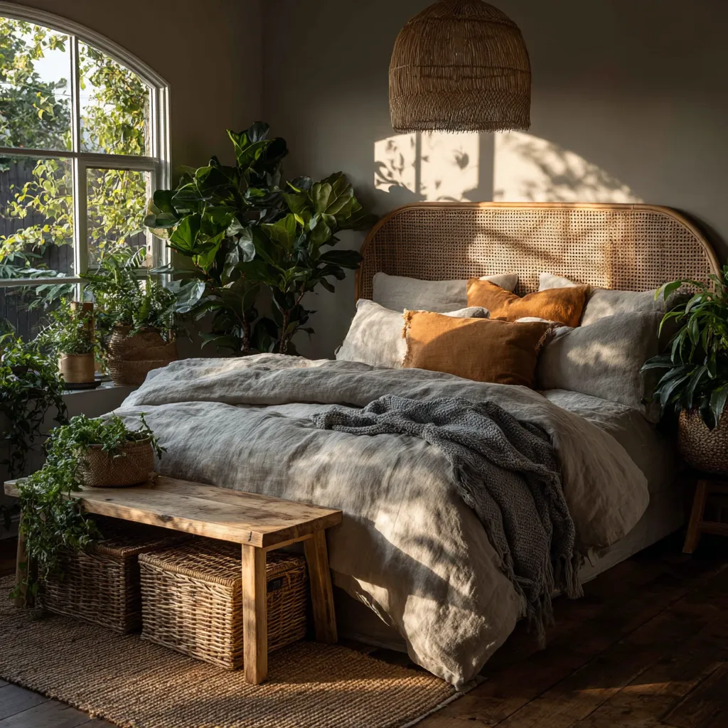 Think about a statement rattan headboard or a woven pendant light to be the focal point. Layer in natural linens, soft cottons, and earthy-toned cushions. A rattan storage bench at the foot of the bed adds both style and practicality. Don't forget your favorite plants to complete the look! It’s about creating a relaxed, inviting, and grounded atmosphere.