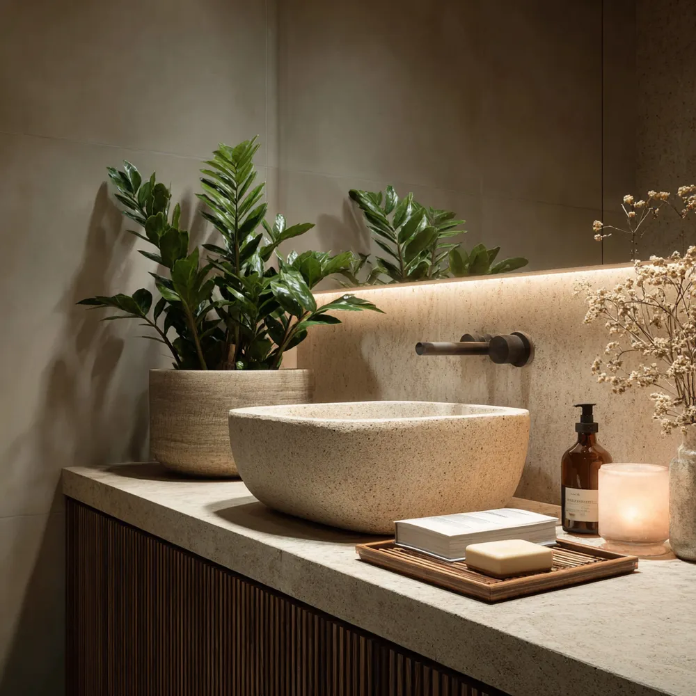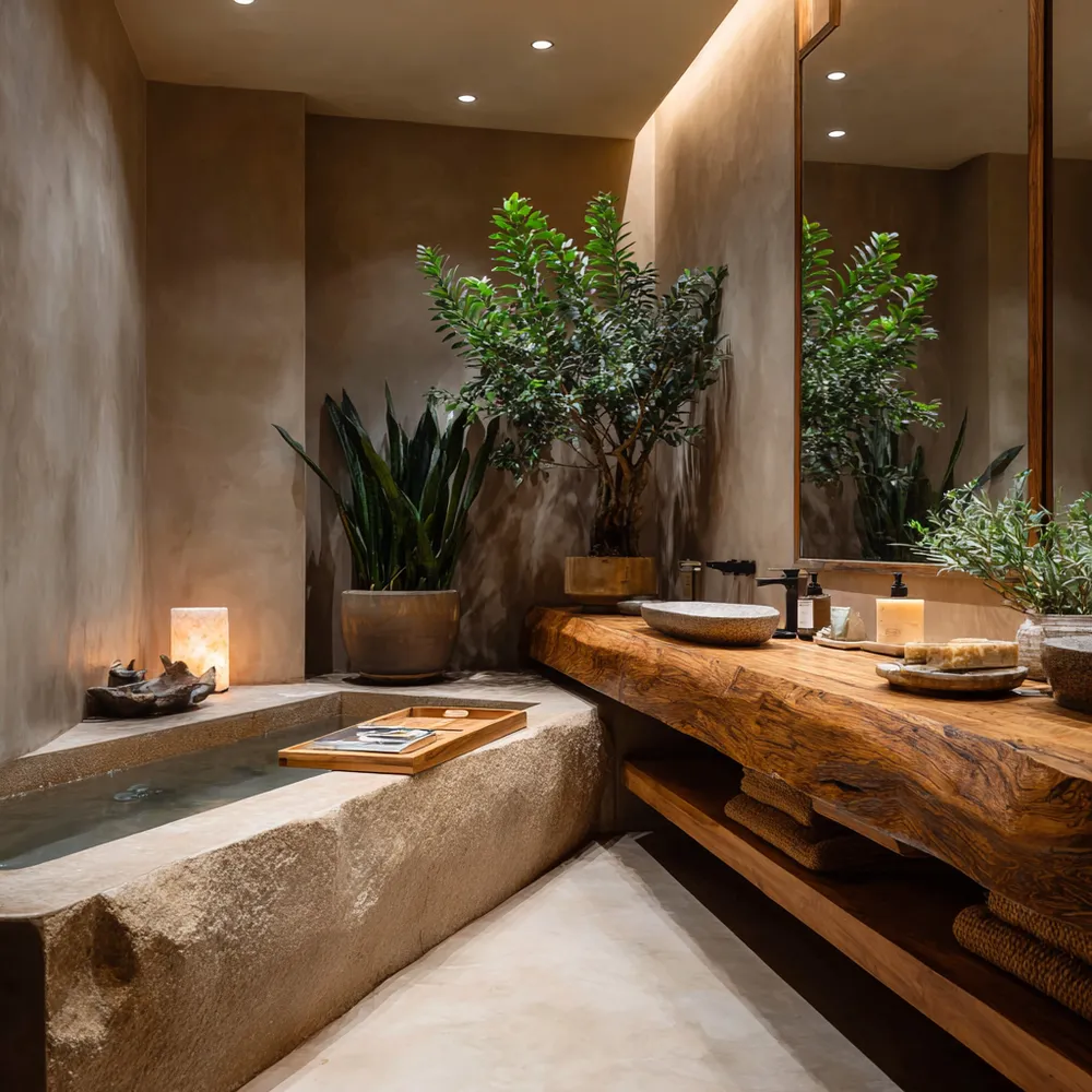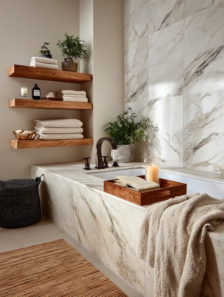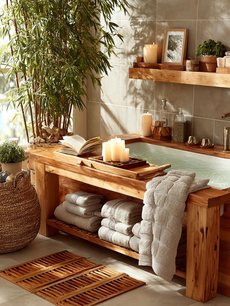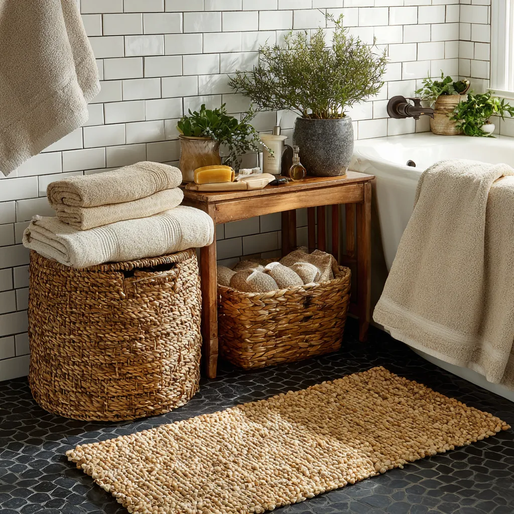 Use woven storage baskets for towels and toiletries, adding instant texture and organization. A natural fiber bath mat can provide warmth underfoot. Consider a small rattan stool or shelf to hold plants or decorative items. Even simple touches like a woven hamper or a rattan-framed mirror can make a significant impact.