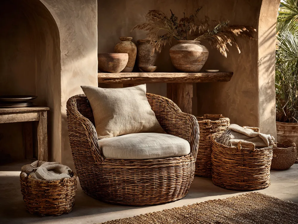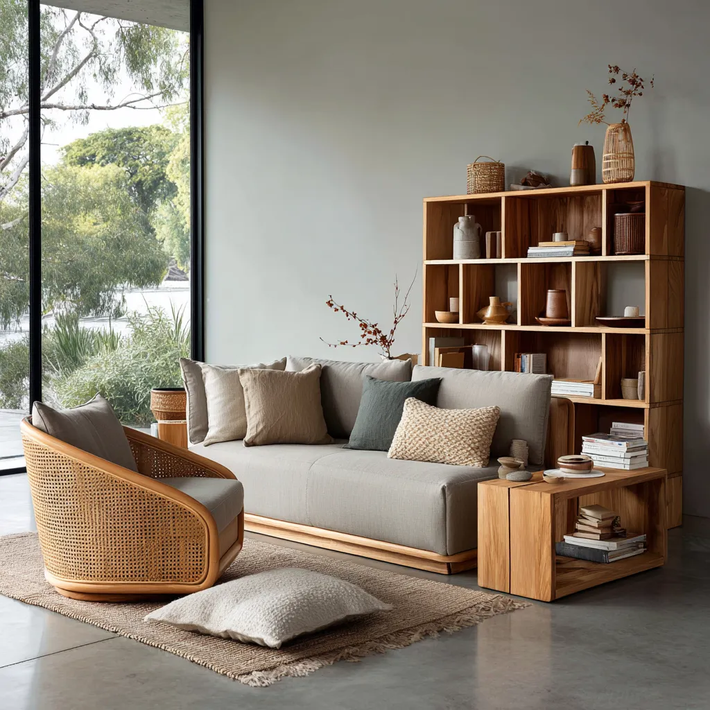 Picture this: a sleek, low-profile sofa complemented by a statement rattan accent chair. Weave in natural wood elements, soft neutral textiles, and minimal, carefully chosen decor. Rattan shelving can beautifully display your treasured pieces without overwhelming the space. It’s about creating a calm, balanced, and serene environment.