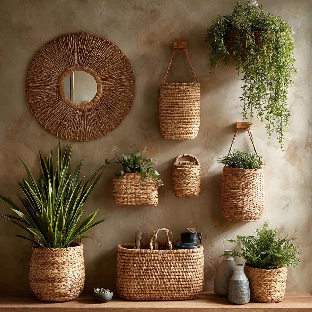 Consider a statement woven wall hanging as a focal point, or opt for smaller woven baskets arranged in a gallery style. Rattan mirrors add reflective beauty and a natural frame. Woven planters bring greenery to your walls, creating a living art piece. These natural elements bring an organic and artisanal feel to your living spaces.