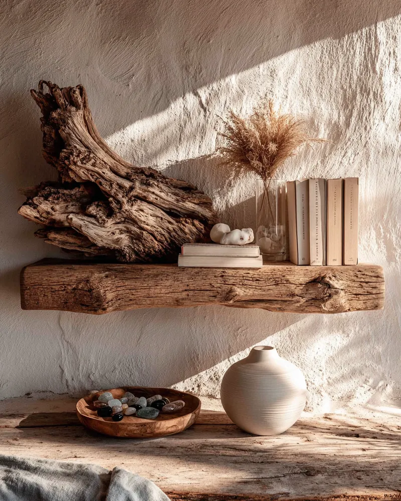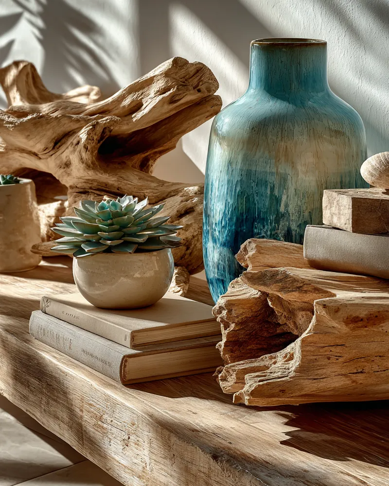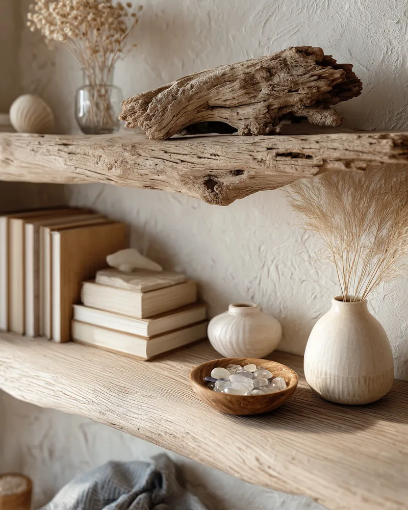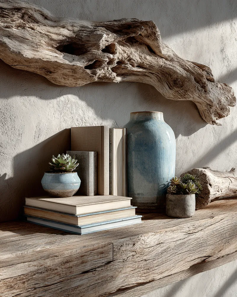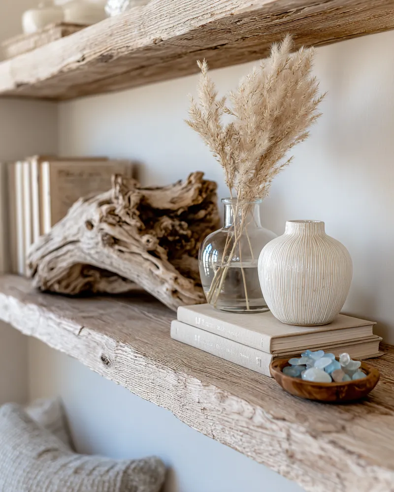 Arrange with intention, leaving space to breathe, for a truly elegant display. Save for your shelf styling inspiration! #CoastalDecorIdeas#ShelfStylingIdeas#VignetteIdeas#HomeDecorIdeas#SeashellDecorIdeas#DriftwoodDecor#CoastalVignettes#InteriorStyling#HomeAccents#DecorInspo