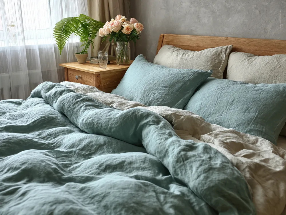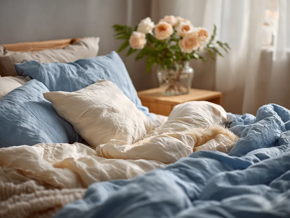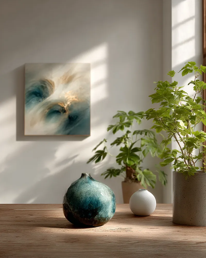 • **Bedding Accents:** Pillows with subtle abstract patterns in muted blues.