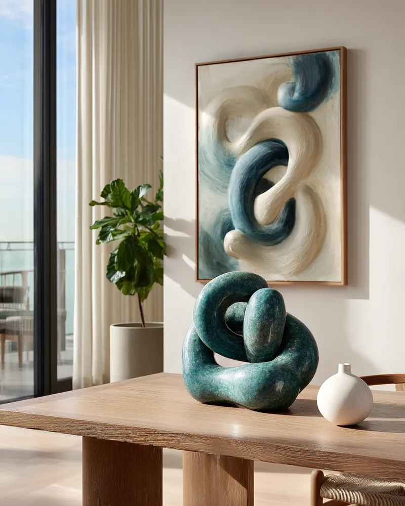 Creating a personal haven that inspires rest and reflects your appreciation for artistic expression. Save this for your bedroom design journey! ✨ #BedroomIdeas#AbstractBedroom#BlueDecor#SereneSanctuary#ArtisticInteriors#DesignInspo#SculpturalHome#CalmMood#HomeStyling#DreamBedroom
