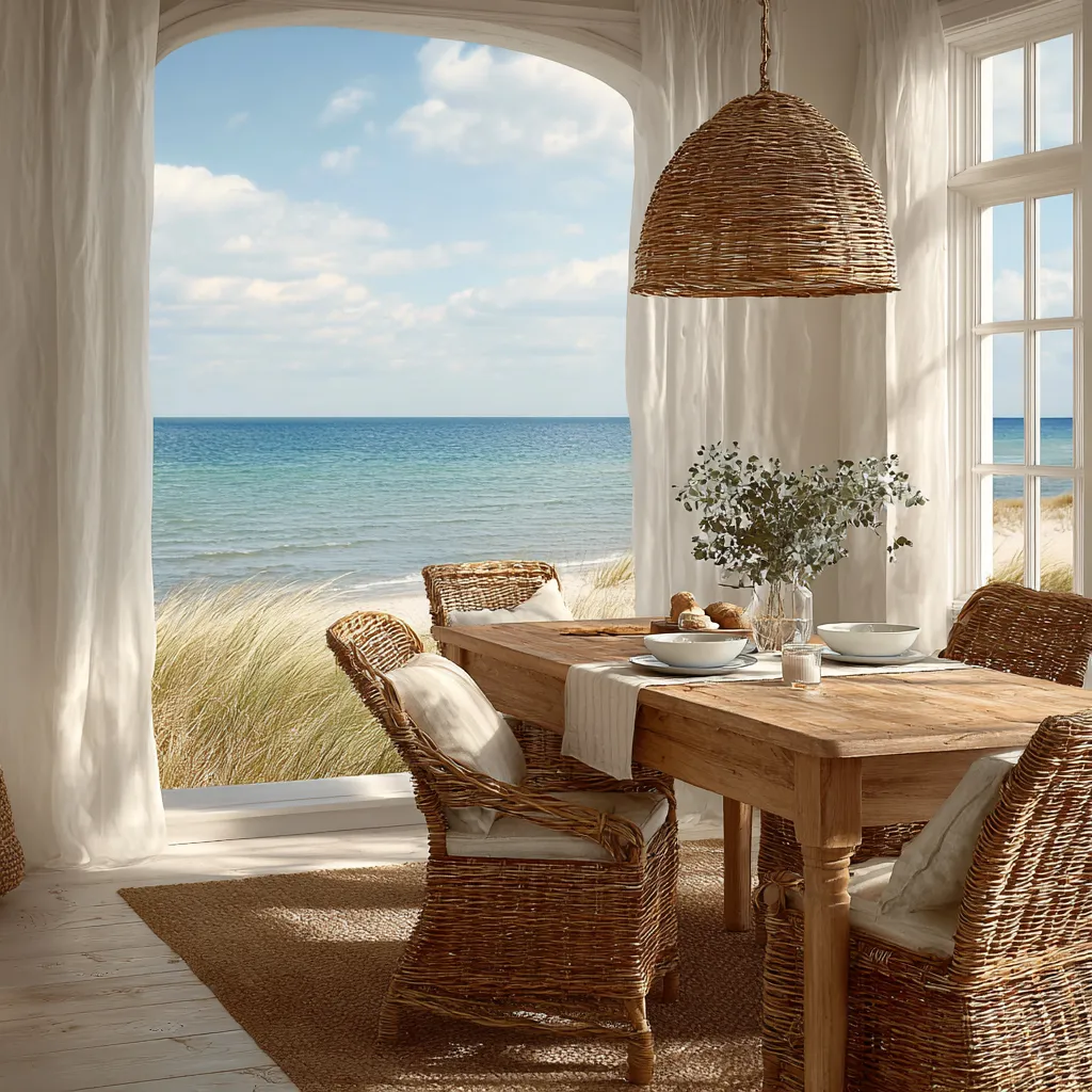 * **Natural Materials:** A light wood dining table, rattan chairs, or linen placemats.