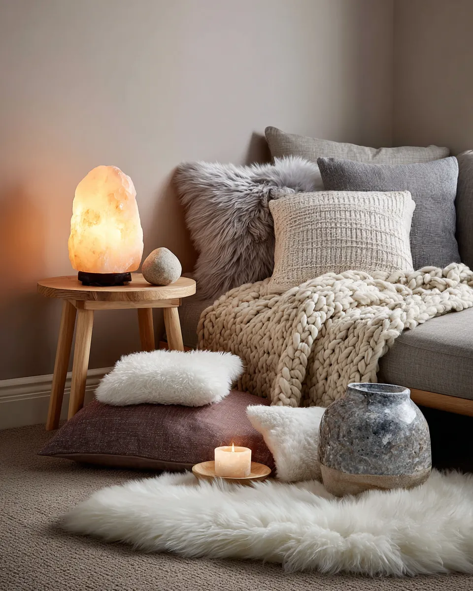 * Layer soft textiles: think plush throws, sheepskin rugs, linen cushions.