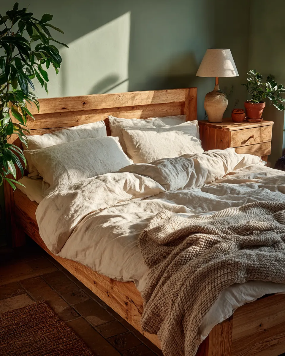 🪵 Natural Wood Elements: A solid wood bed frame and bedside tables.