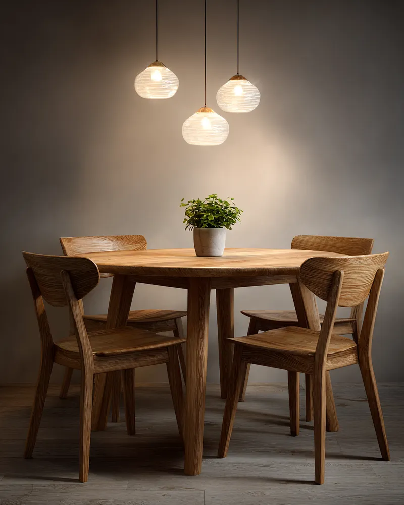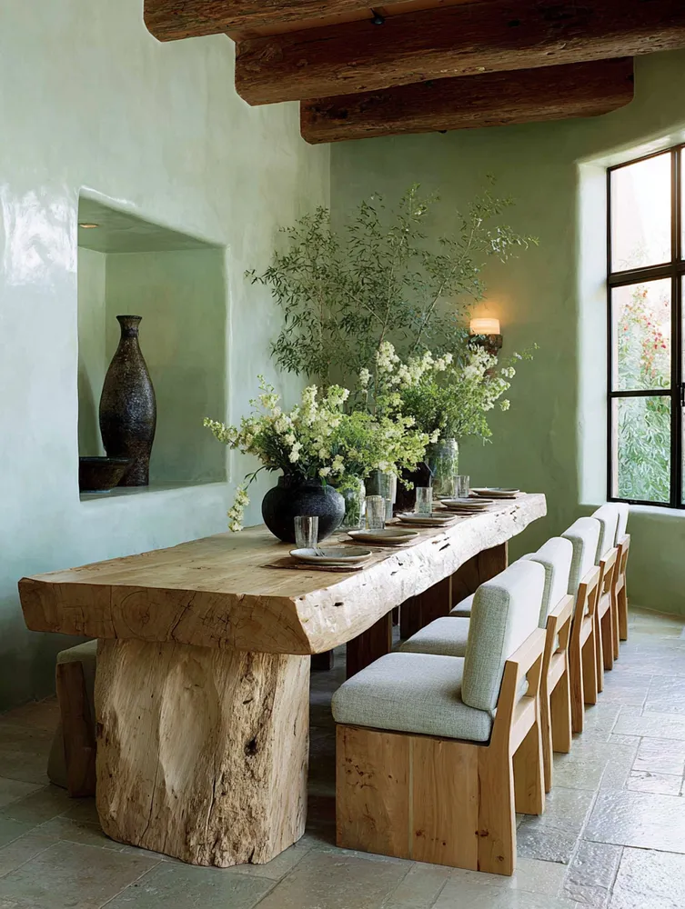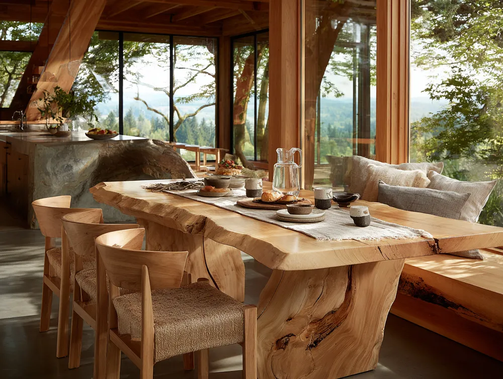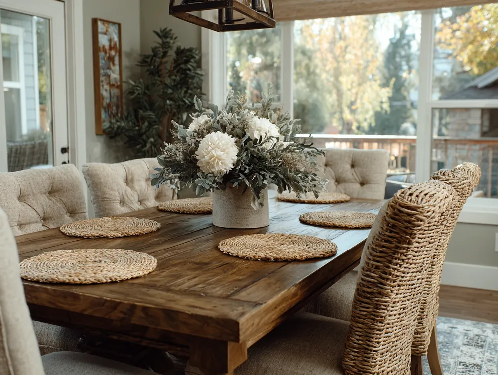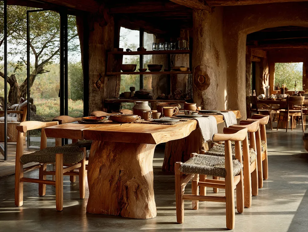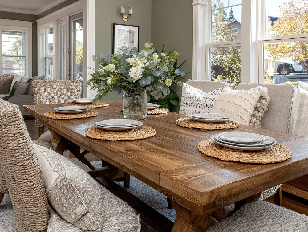 • Natural wood table: Opt for a solid wood dining table, ideally unfinished or lightly treated.
