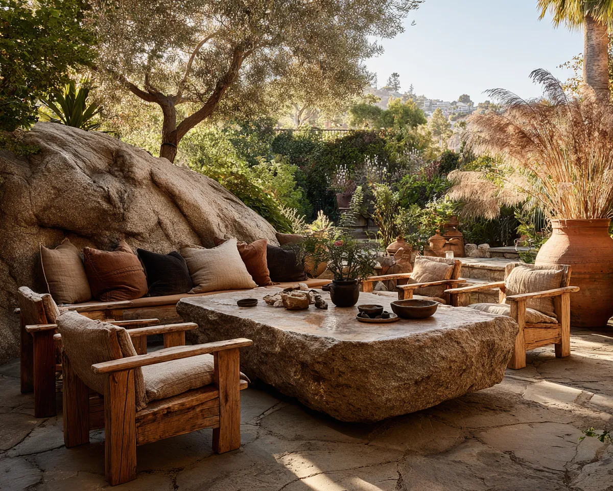 • Natural Textures: Incorporate rough wood grains, stone surfaces, and natural fiber cushions.