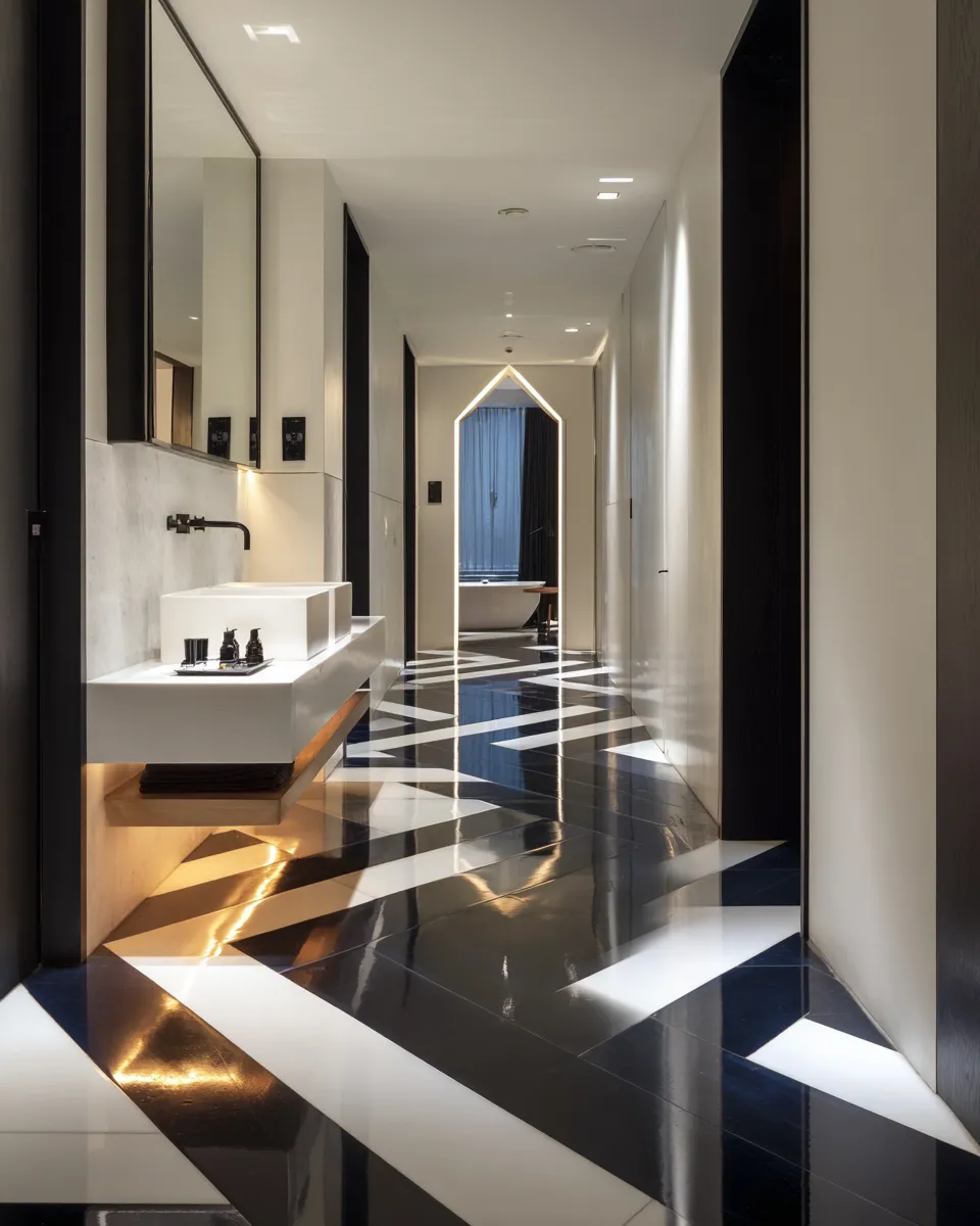 Art Deco Glamour: Geometric Lines & Luxurious Textures for a Statement Bathroom 💎🖤