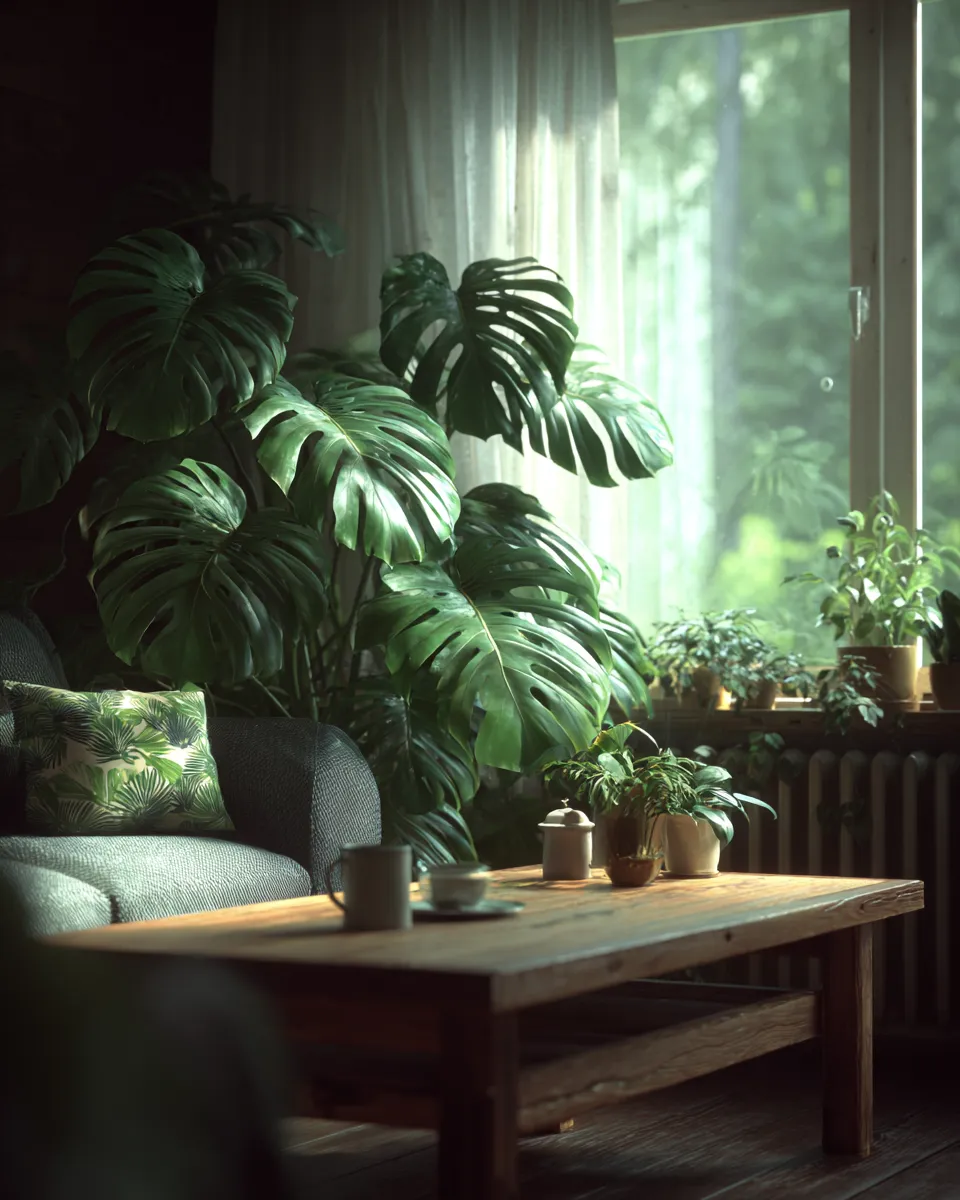 Transform your living room into a verdant sanctuary! 🪴 Biophilic design in living spaces creates a calming atmosphere and connects you with nature. Think a statement plant like a Monstera, a lush grouping on a side table, or trailing plants cascading from shelves.