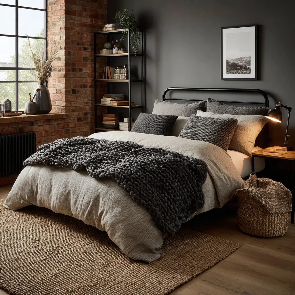 Who says industrial can't be cozy? Let’s create a bedroom retreat with that raw, inviting feel. Start with a statement bed frame – think dark metal or reclaimed wood. Soften the look with layers of texture: a chunky knit throw, linen bedding, and a plush rug. Exposed brick or concrete walls can add depth, or opt for a deep, moody paint color. Industrial pendant lights or a statement floor lamp add ambient warmth. ✨ Keep accessories minimal and functional for that signature industrial edge. Save this for your dream bedroom! #IndustrialBedroom#IndustrialBedroomIdeas#BedroomIdeas#CozyBedroom#IndustrialDecor#BedroomInspo#MetalBedFrame#TexturedBedding#MoodLighting#RusticBedroom#HomeDecorInspiration