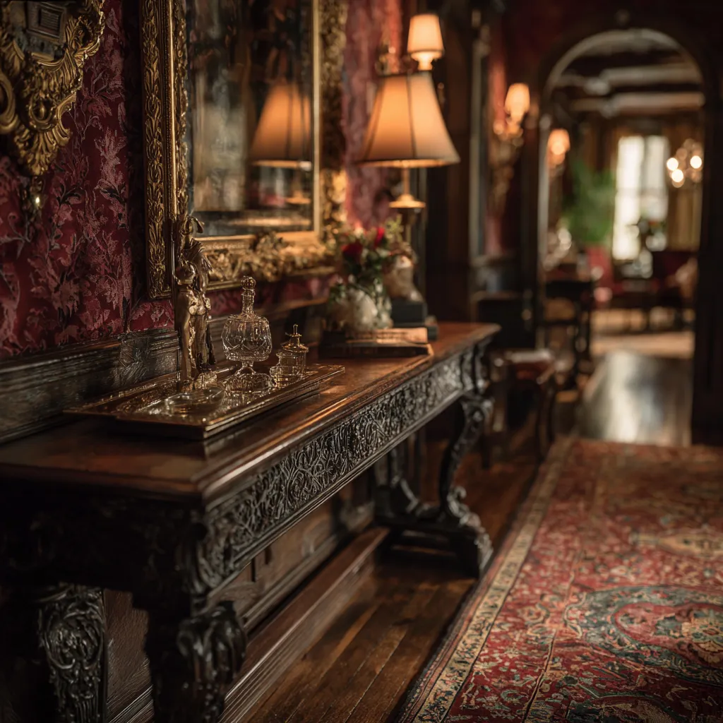Make a statement the moment guests arrive! A Gilded Age entryway is all about drama and a touch of old-world charm. Imagine a console table made of dark, exotic wood, adorned with a large, ornate gilt mirror above it. A beautiful Oriental rug on the floor adds color and warmth, while a statement piece of decorative art or an antique vase with fresh blooms completes the look. 🌸 This creates an immediate sense of arrival and sophistication. Save these ideas for a truly grand entrance! ✨