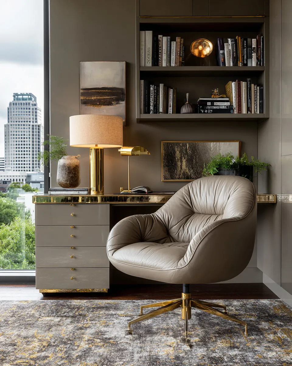 Opt for a stylish desk – perhaps a mirrored or dark wood finish – paired with an ergonomically sound yet elegant chair. Incorporate refined storage solutions like lacquered cabinets or floating shelves with decorative boxes. Add personality with curated artwork and ambient lighting from a stylish desk lamp. A plush rug can define the workspace and add warmth. This blend of function and form is key.