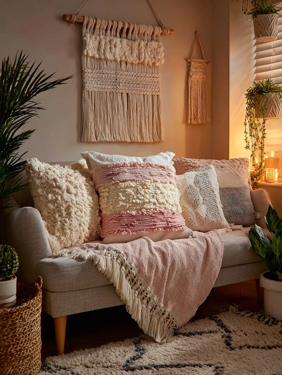 Loving these boho textures? Save for your next decor refresh! 🧡 #BohoDecorIdeas#HandmadeTextileIdeas#ArtisanalRugIdeas#MacrameIdeas#TexturedHomeIdeas#BohemianStyle#HomeDecorInspo#Handwoven#InteriorDesign#CraftyHome