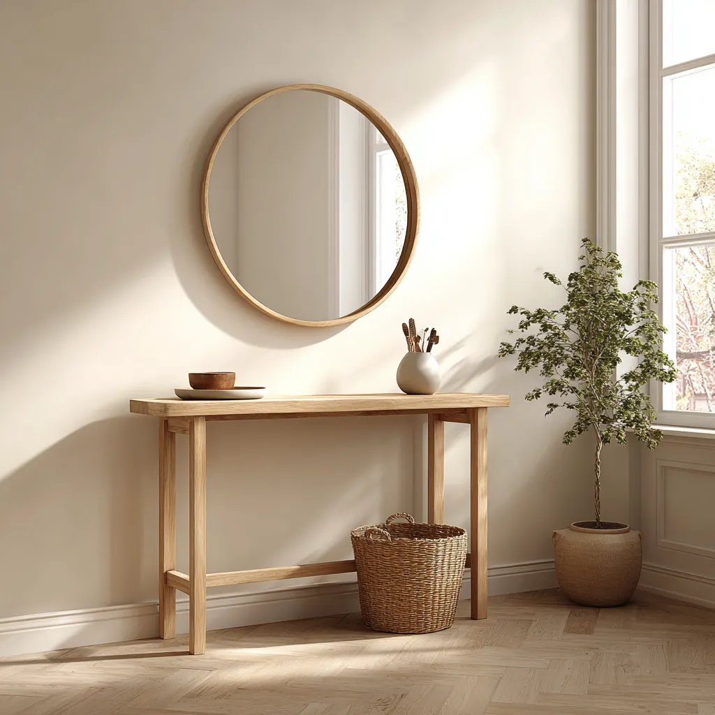 * **Wooden Bench/Console:** A simple, clean-lined piece in light oak or walnut.