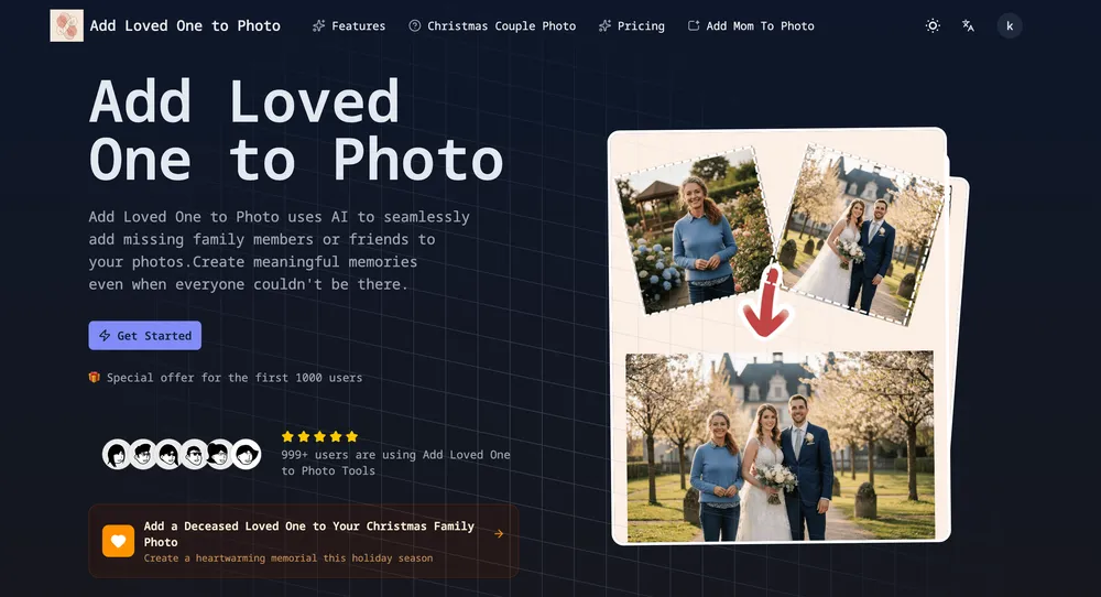 <a href="https://addlovedonetophoto.com/">Add Loved One to Photo</a> uses AI to seamlessly add missing family members or friends to your photos.Create meaningful memories even when everyone couldn't be there.