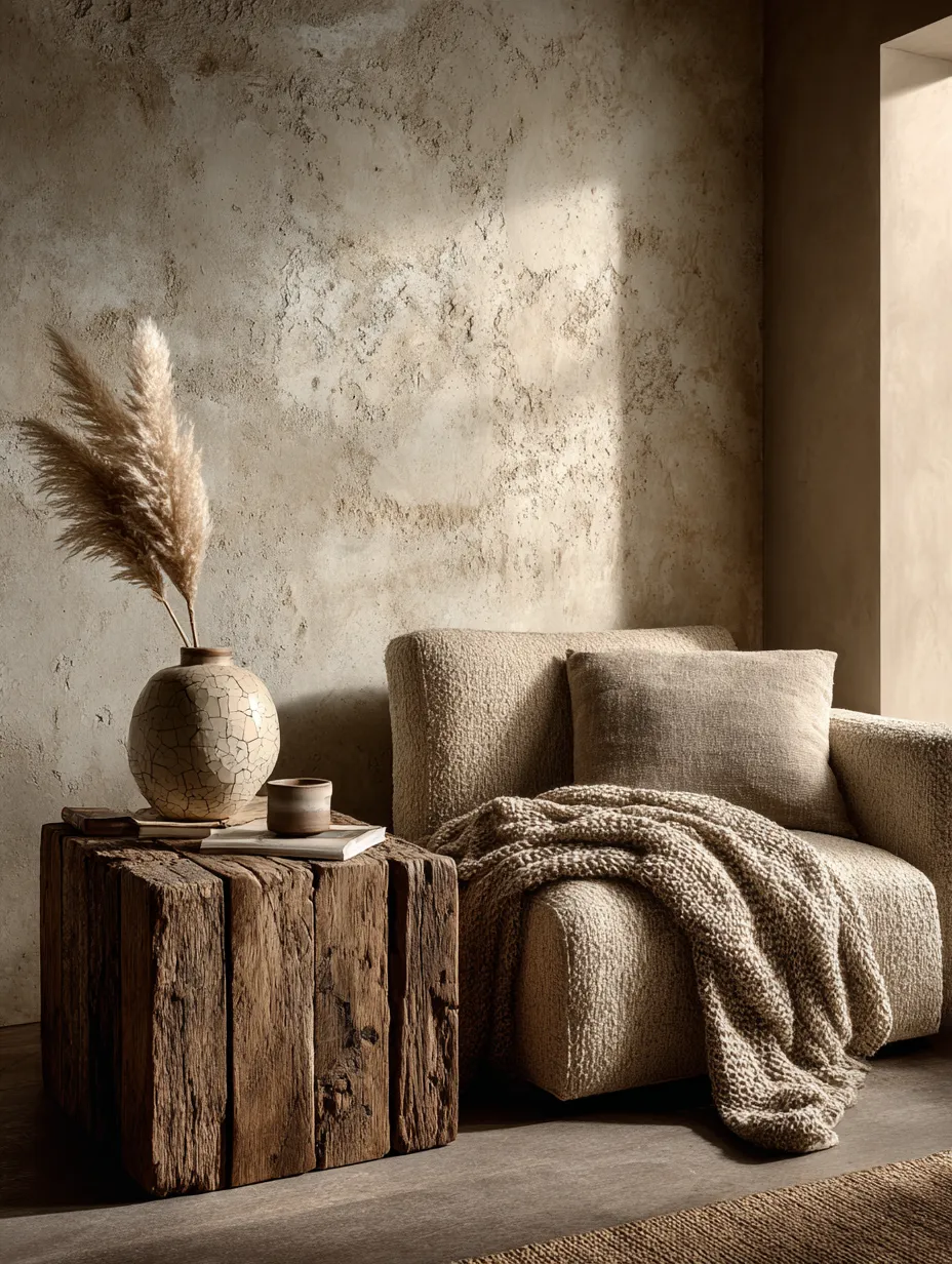 * **Natural Materials:** Favor materials like rough wood, unpolished stone, linen, and handmade ceramics.