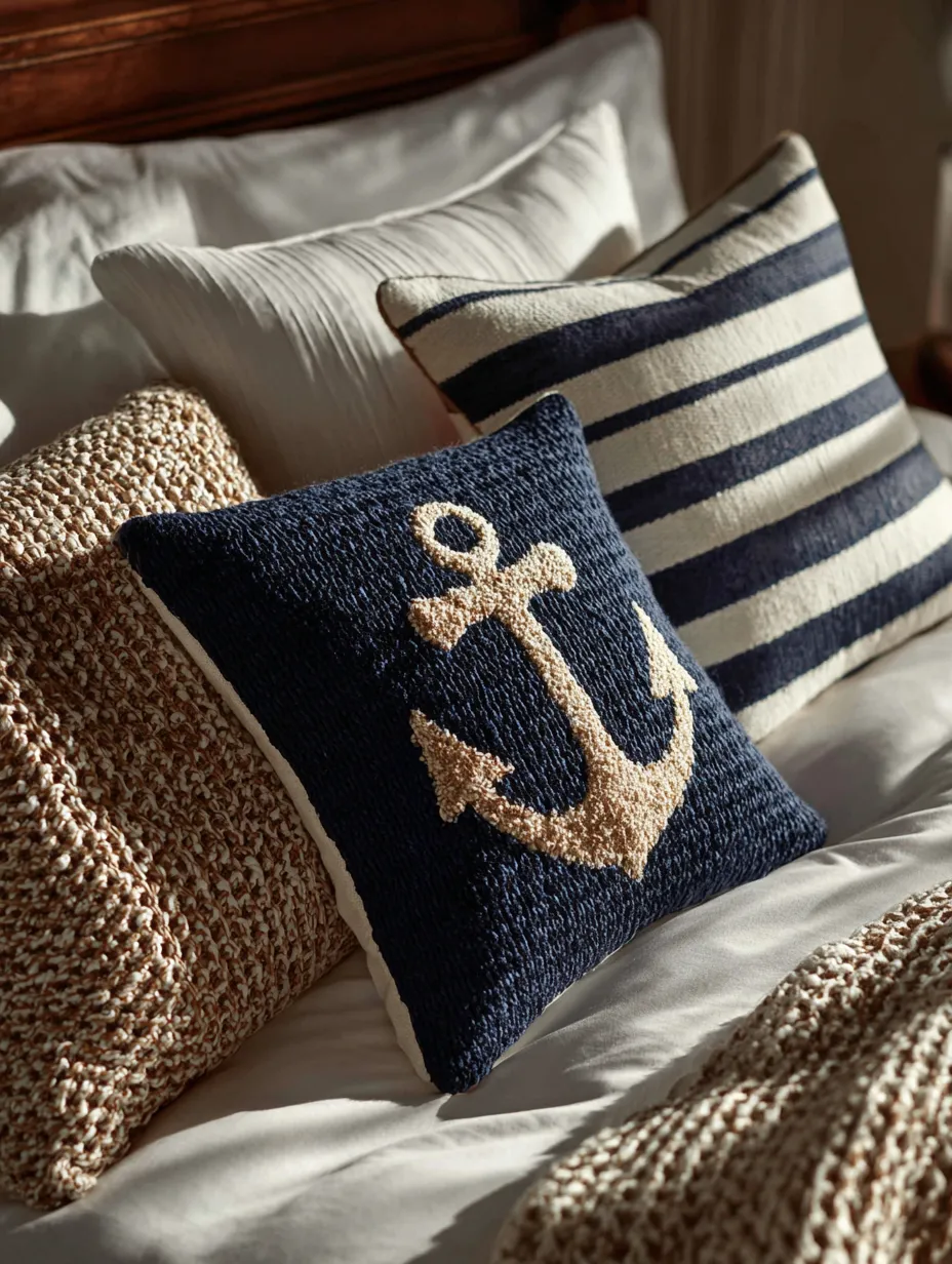 Add a touch of maritime charm to your bedroom with nautical-themed pillows. ๐ Think of cushions featuring anchor motifs, rope designs, or in classic navy and white stripes.