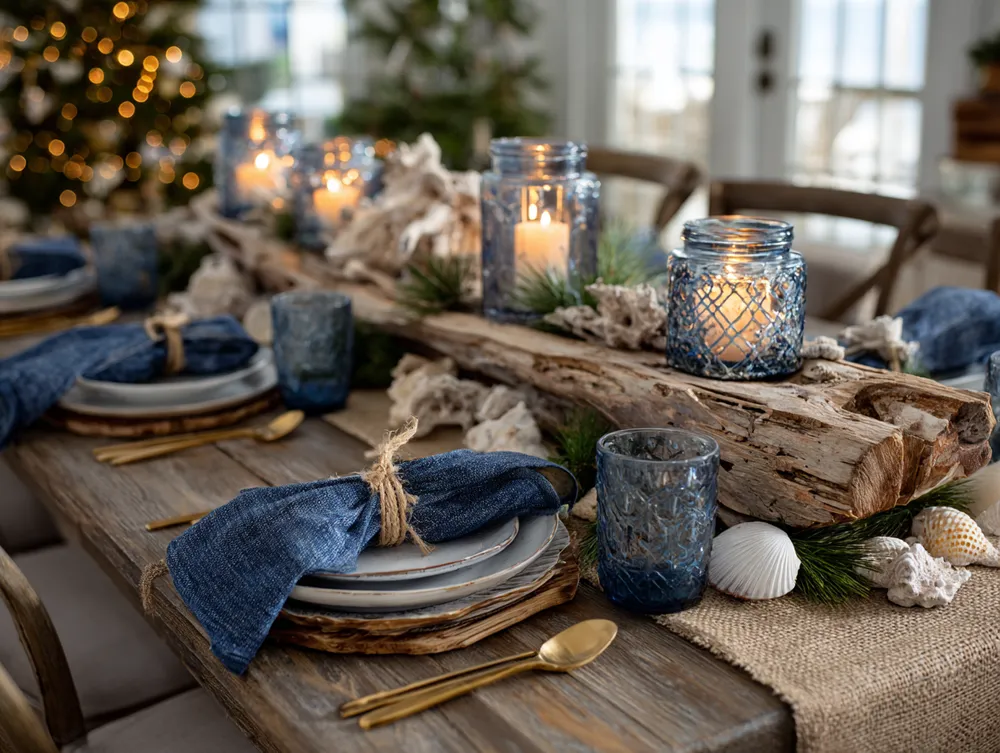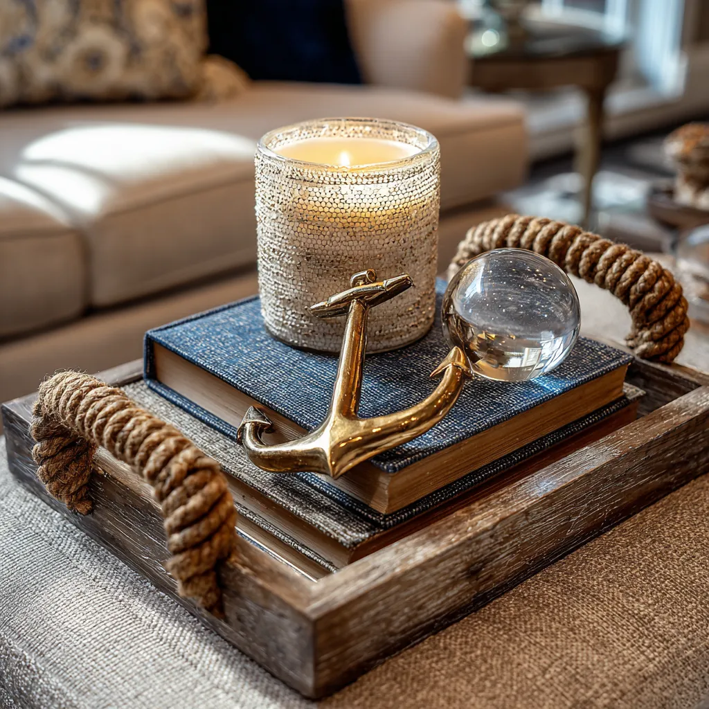 Elevate your living room's coffee table with a nautical tray. 🌊 Arrange items like a collection of nautical-themed books, a candle with a sea-salt fragrance, and a small glass orb resembling sea glass.