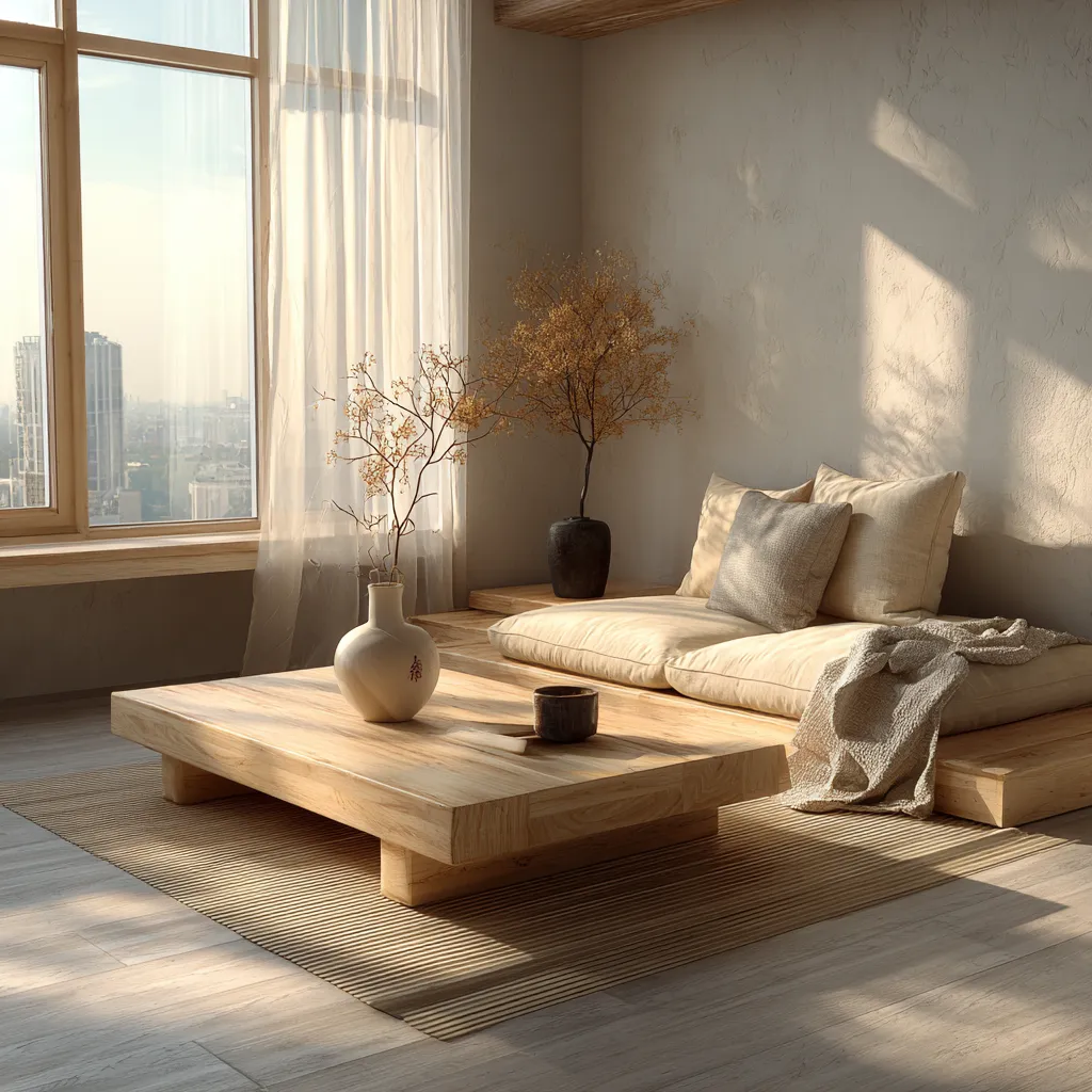 Focus on natural materials: light woods like ash or maple, woven textures, and subtle ceramic accents. Keep the color palette muted and serene – soft grays, earthy neutrals, and whites. Furniture should have clean lines and a minimalist aesthetic. Integrate natural light as much as possible, using sheer drapes or bare windows.