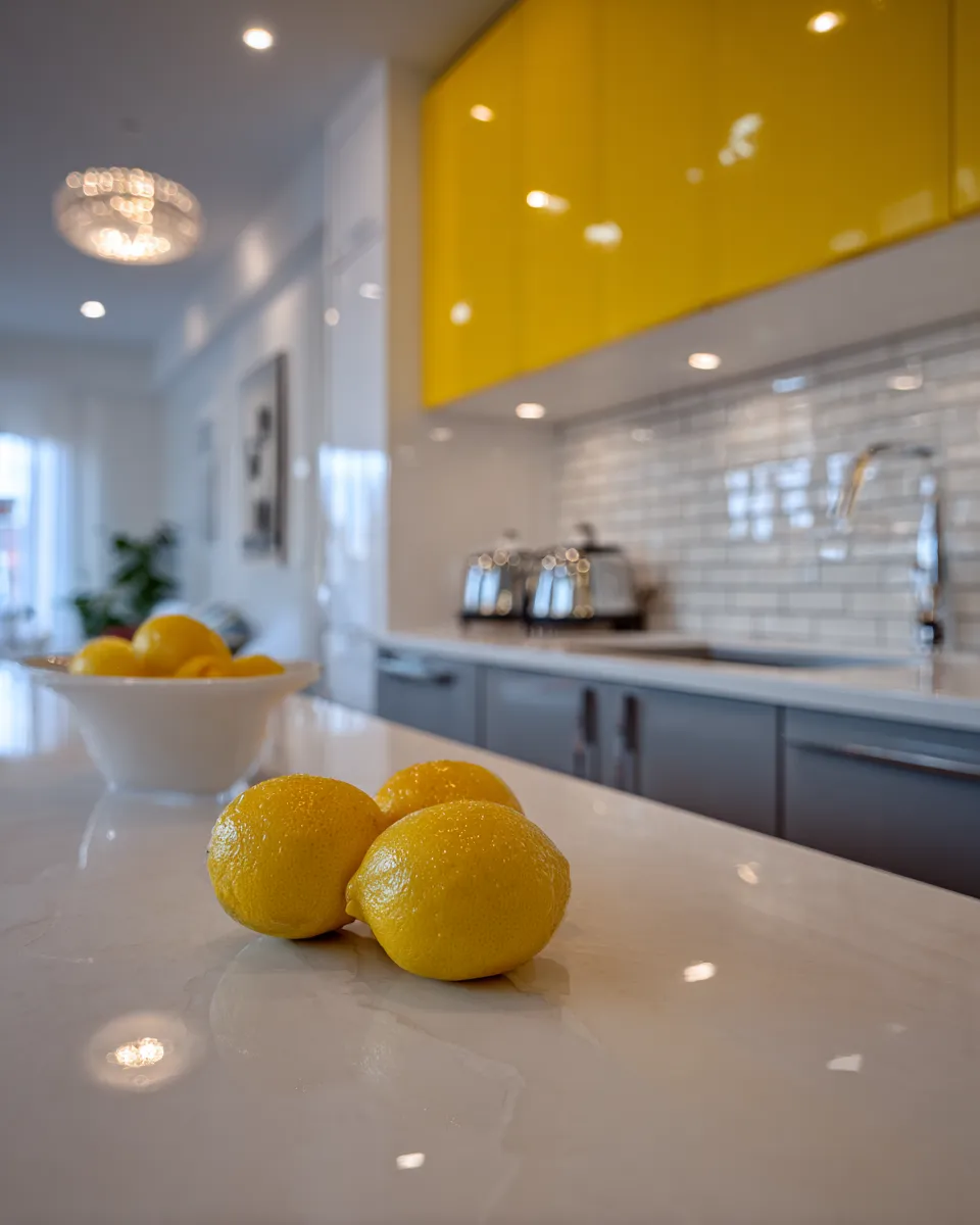 * **A subtle grey backdrop with pops of canary yellow on small appliances and decor.**