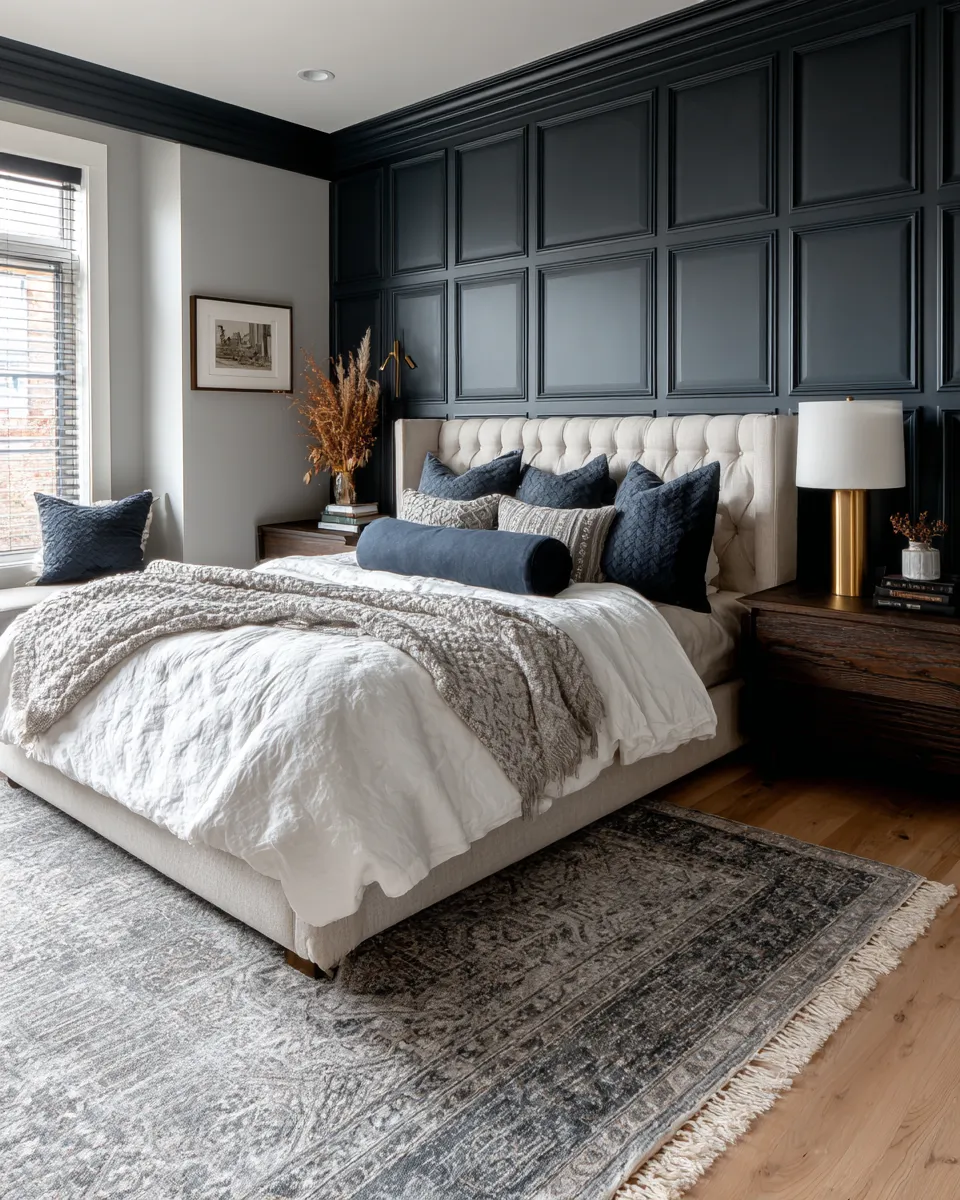* **A deep navy accent wall** behind the bed for dramatic effect.