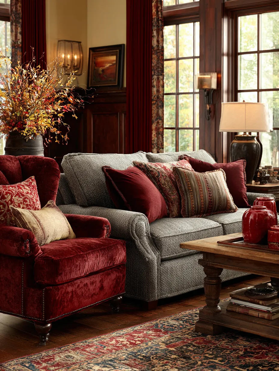 Crimson pairs beautifully with warm neutrals, deep greys, and even touches of deep navy or forest green for a sophisticated look. Save this for your cozy living room design! 💫 #CrimsonLivingroomIdeas#BoldColorIdeas#CozyHomeIdeas#LivingroomAccentIdeas#WarmColorIdeas#InteriorDesign#HomeDecor#ColorInspiration#RedDecor#InvitingSpaces