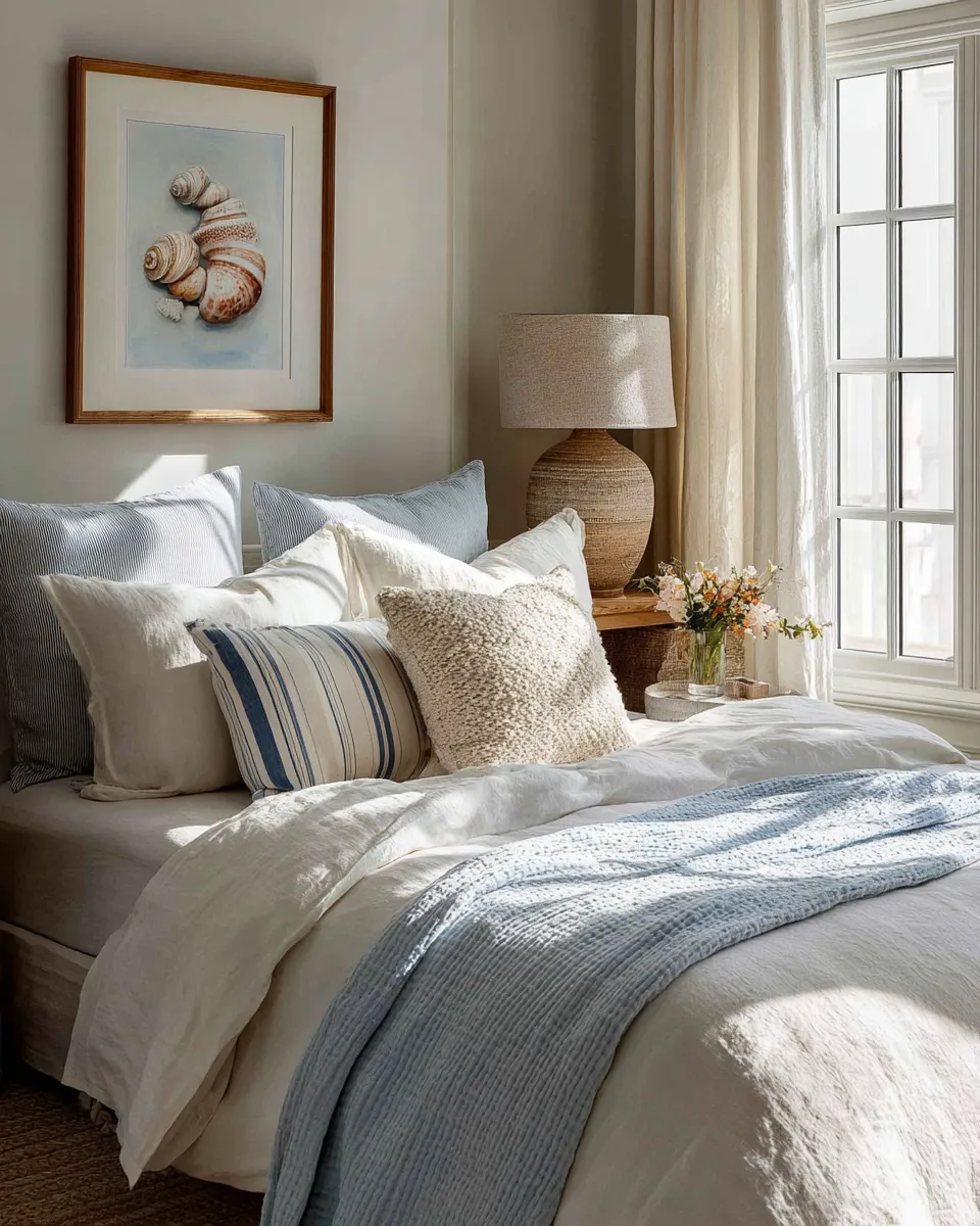 ๐ **Bedding:** Opt for natural materials like linen or cotton in soft blues, whites, or sandy tones.