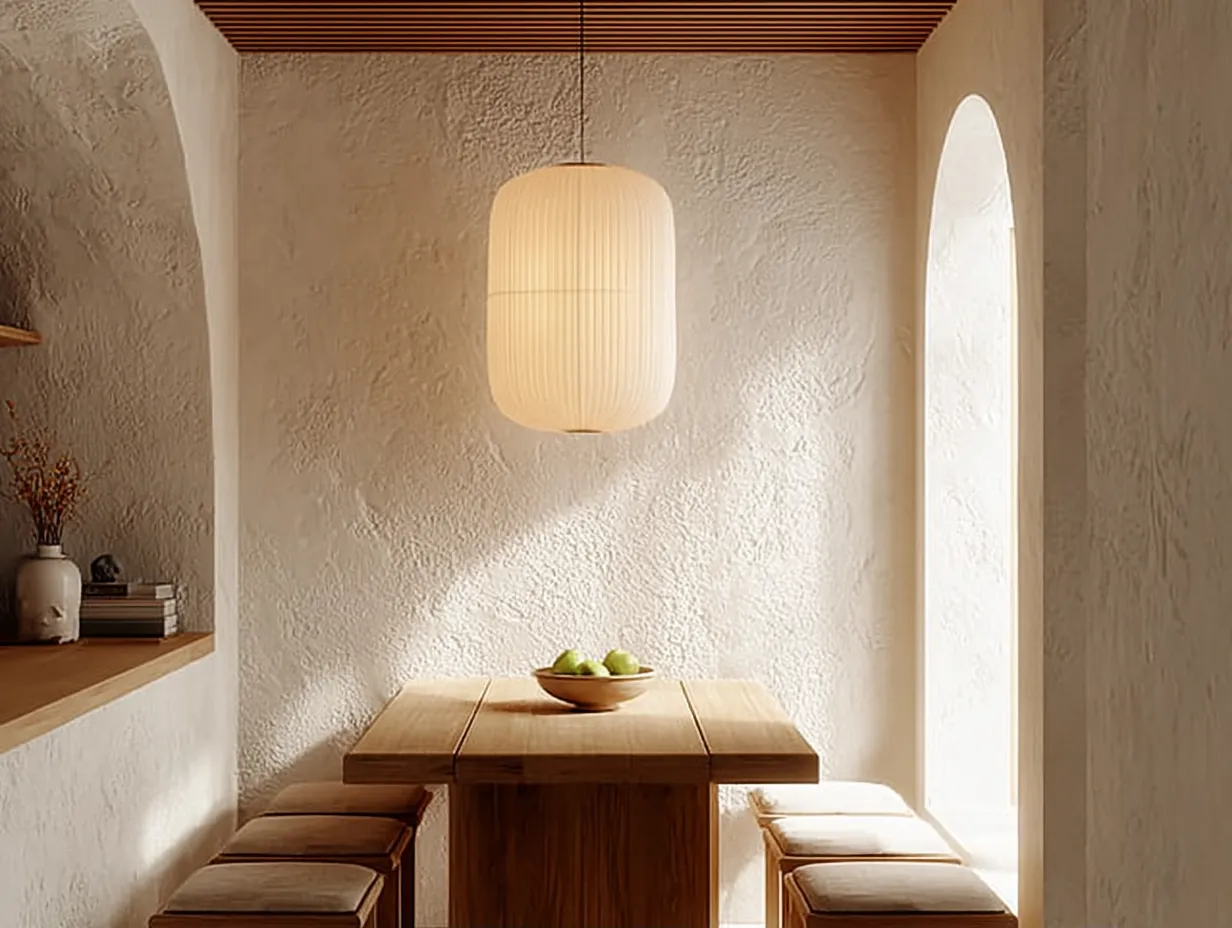 * **Subdued Lighting:** A pendant light with a natural shade (like paper or bamboo) over the table.