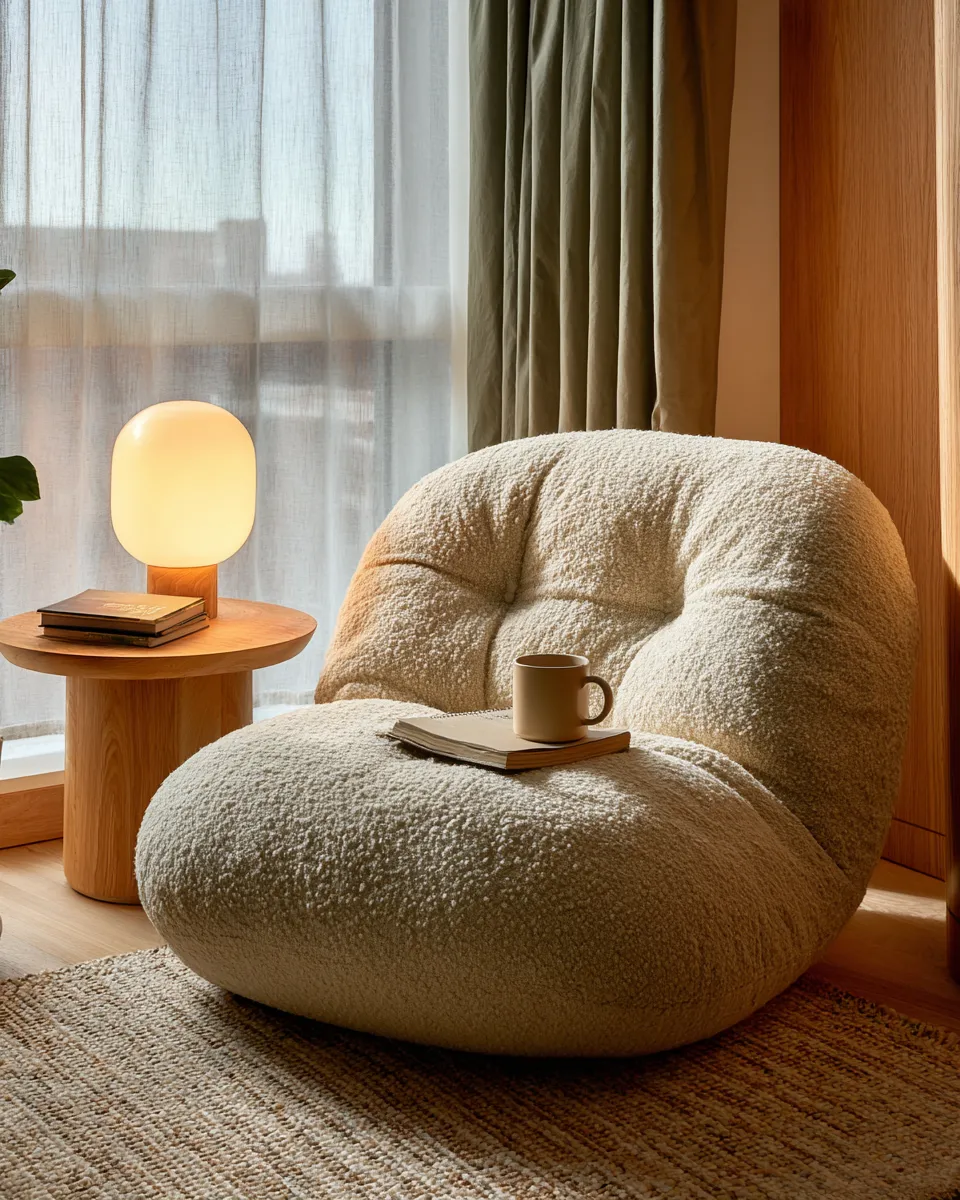 Choose a comfortable armchair upholstered in natural fabrics like linen or soft cotton. Place it near a window for natural light. Add a small, minimalist side table made of wood for your book and a warm beverage. Soft ambient lighting, like a sculptural floor lamp, is essential for evening reads.