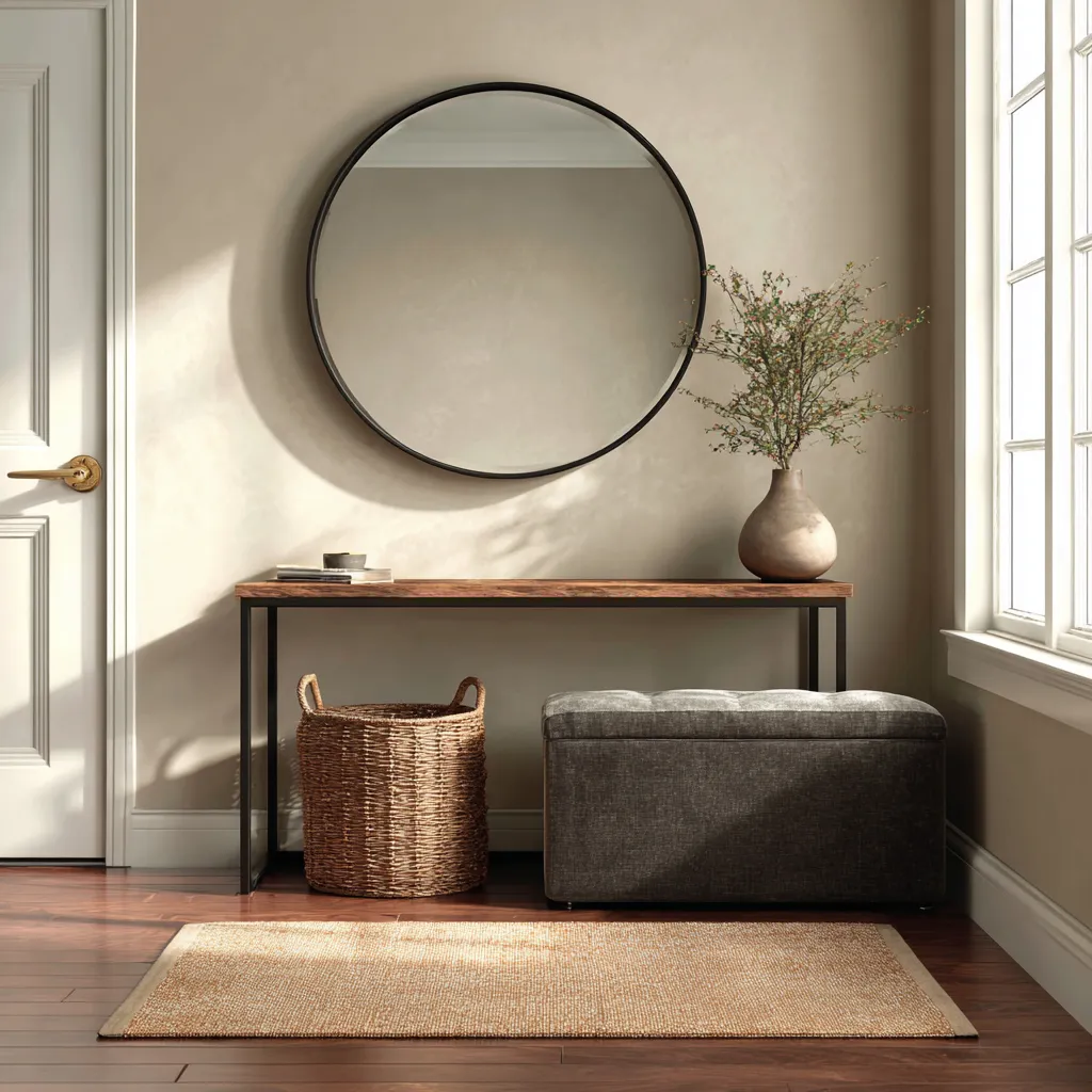 * **Functional Decor:** A beautiful mirror to check yourself, and a slim console table.