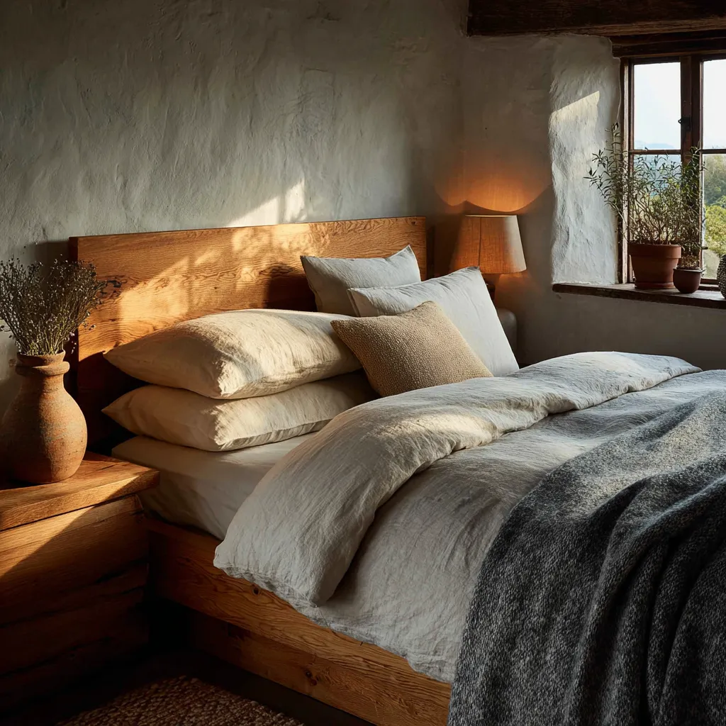 * **Natural Materials:** Wood bed frames, linen bedding, and wool throws.