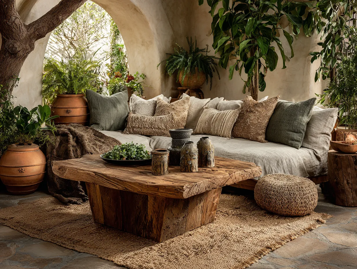 🌳 Textiles: Incorporate jute rugs, linen upholstery, and cotton throws with natural weaves.