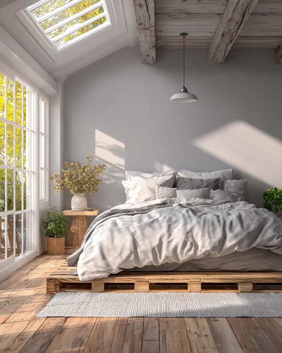 Create a serene retreat with a Scandinavian-minimalist bedroom. The focus is on creating a peaceful and uncluttered environment that promotes restful sleep. Opt for a neutral color palette – whites, creams, and soft greys – to promote tranquility. Natural materials like light wood furniture, linen bedding, and wool throws add warmth and texture. Keep decor minimal and functional, with clean lines and a focus on natural light.