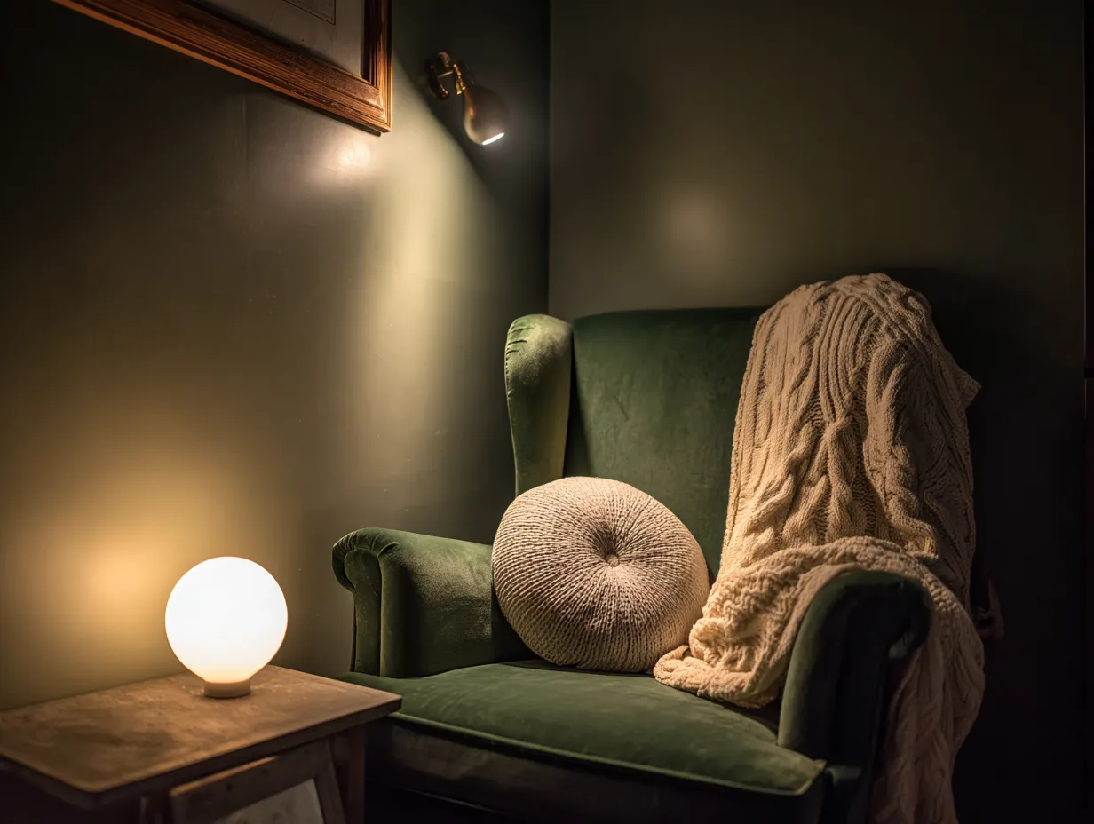 * **Warm ambient lighting:** A soft-glow lamp nearby.