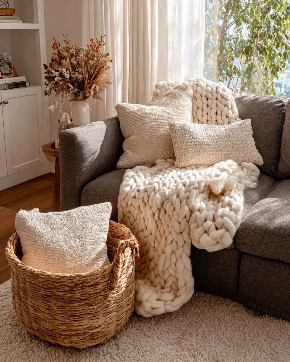 * **Chunky knit throws:** Instant coziness and visual interest on sofas or beds.