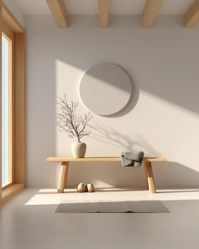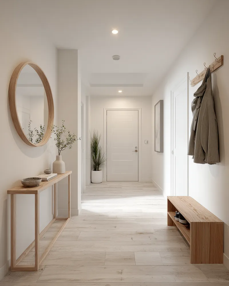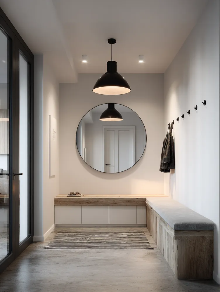 Key elements include a sturdy, minimalist bench for removing shoes, perhaps with a cozy cushion or sheepskin. Wall-mounted hooks or a sleek coat rack are essential for organization. A large mirror reflects light and makes the space feel more expansive. Consider a natural fiber rug for texture and warmth underfoot. A small console table for keys and mail, perhaps topped with a plant or a decorative bowl, completes the look.