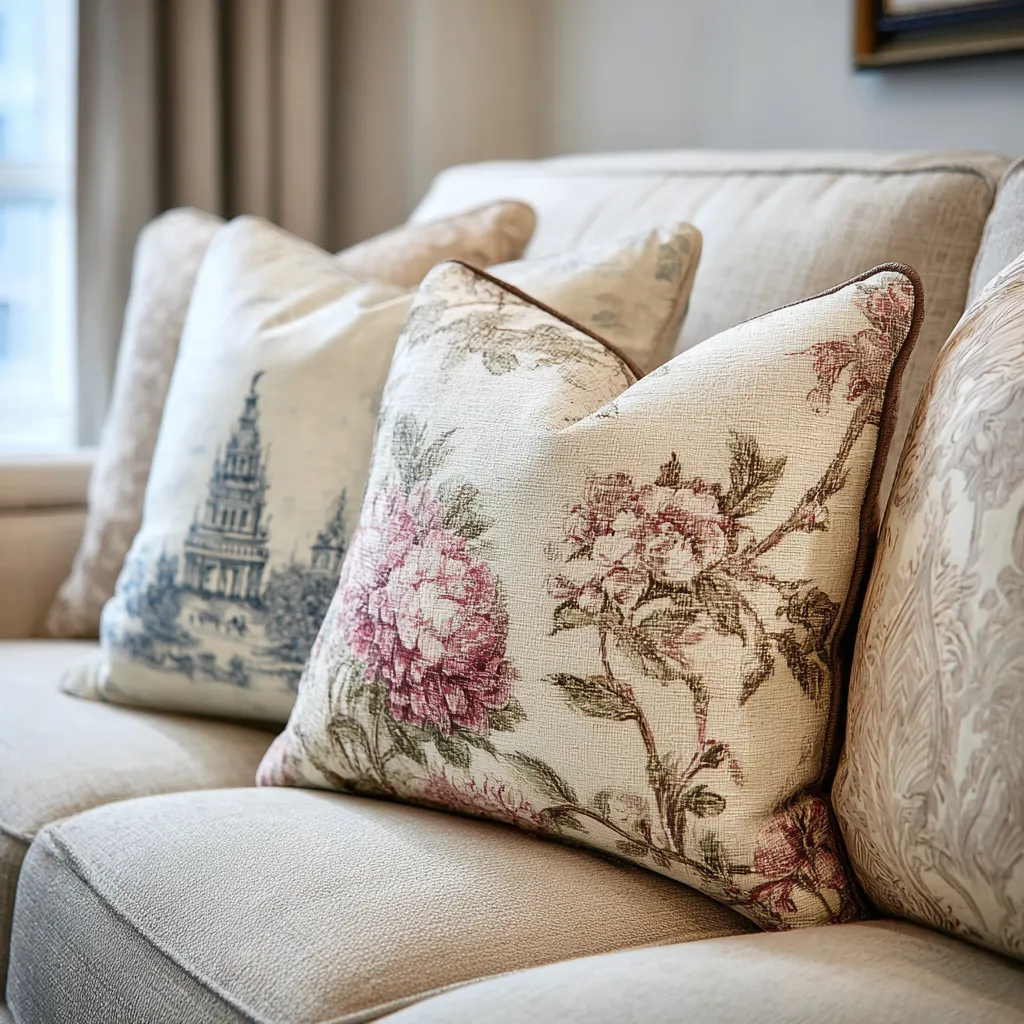 Use them in upholstery, curtains, wallpaper, or accent pillows. A classic toile print depicting pastoral scenes adds depth and a narrative touch. Delicate, vintage-inspired florals bring softness and natural beauty.