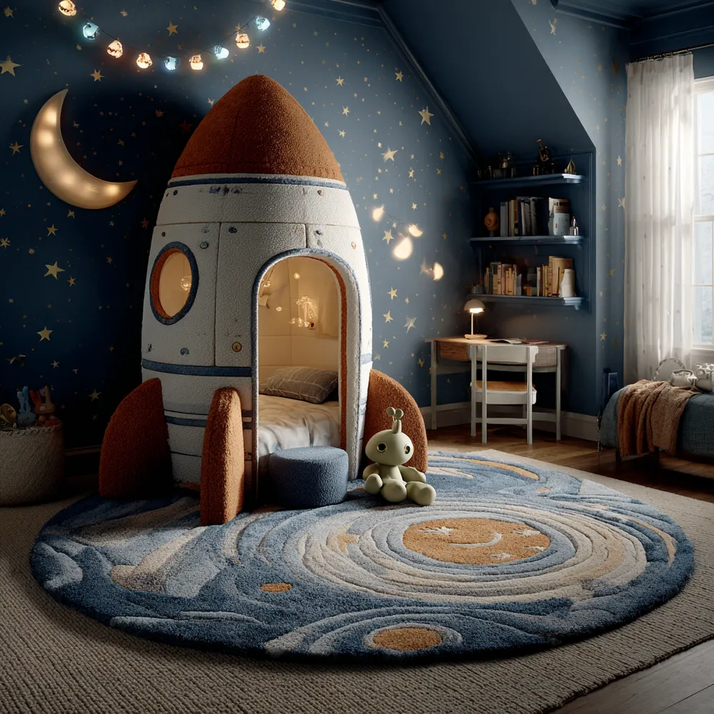 Create a magical galaxy for your little astronauts! 🚀 [Celestial Designs] loves bringing the cosmos to life for children. Think walls painted in deep blues or purples, adorned with glow-in-the-dark stars and planets. A bed shaped like a rocket or moon can be a showstopper. Soft, whimsical lighting, like fairy lights or a nebula projector, enhances the enchantment. Plenty of soft cushions and plush toys create a cozy haven. ✨ Fun, safe, and inspiring. 🌟 Glow-in-the-dark elements add magic. 💫 Prioritize imaginative play.