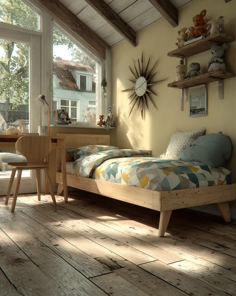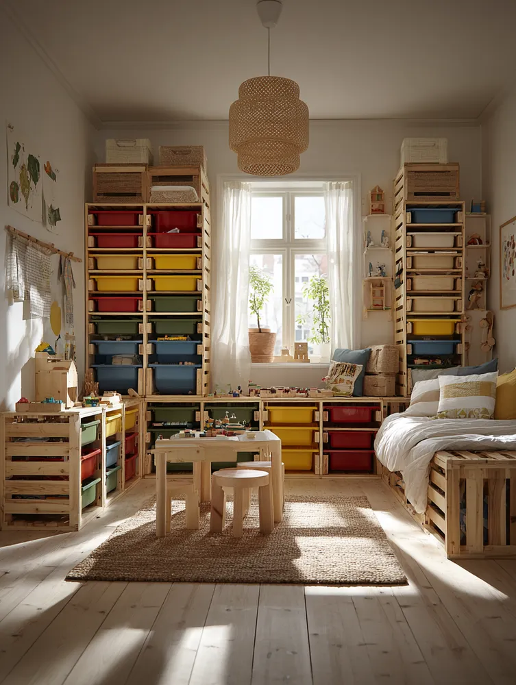 Create a playful yet serene environment for children with Scandinavian design principles. Focus on natural materials, muted color palettes, and functional yet beautiful furniture. 🎨 Think pale woods, soft greys, whites, and pops of gentle pastels or primary colors. Montessori-inspired toys, soft textiles, and ample natural light contribute to a calm atmosphere for play and rest. Safety and simplicity are key to fostering creativity and a peaceful childhood. This style promotes mindful living for even the youngest members of the family.